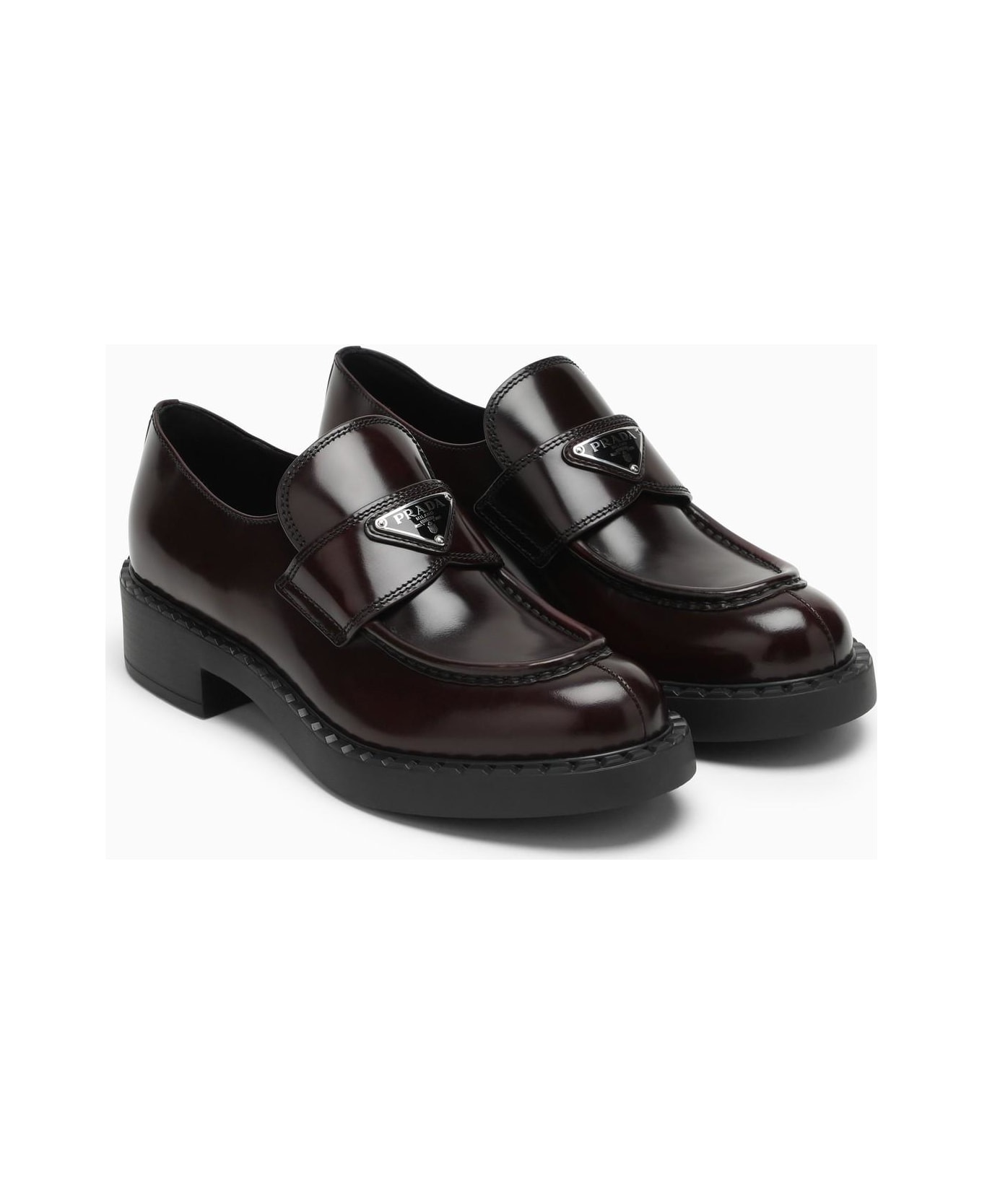 Loafers by Prada in cordovan brushed leather featuring upper with leather band, apron with stitched raised edges, enamelled metal triangle logo, 50 mm rubber sole with hot-stamped logo and notched rubber welt. Composition: 100% Leather / Rubber sole
