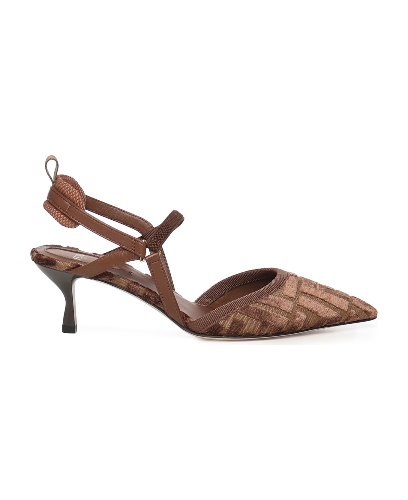- Made of jacquard velvet with FF motif - Thin elastic straps - Rubber sole - Heel height: 55 mm - Made in Italy - Designer color: Brown