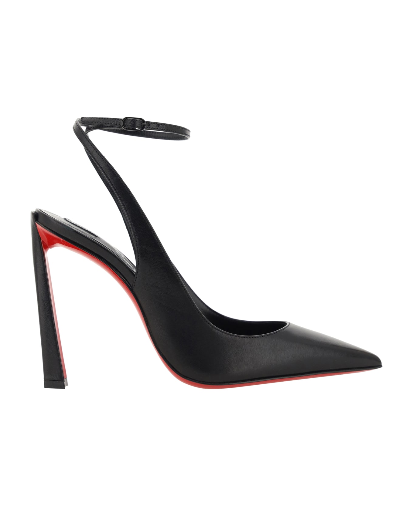 Goatskin condora strap pumps by christian louboutin, geometric heel, an elongated toe, a contrasting iconic red sole, and an adjustable ankle strap.