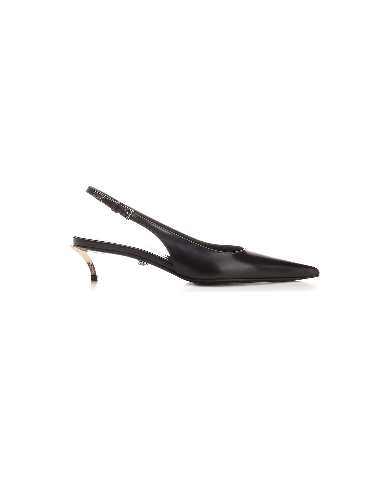 'Pin-Point' Slingback Pumps from Versace in black leather featuring an elongated pointed-toe silhouette and a curved, silver-tone kitten heel Composition: 100% VL