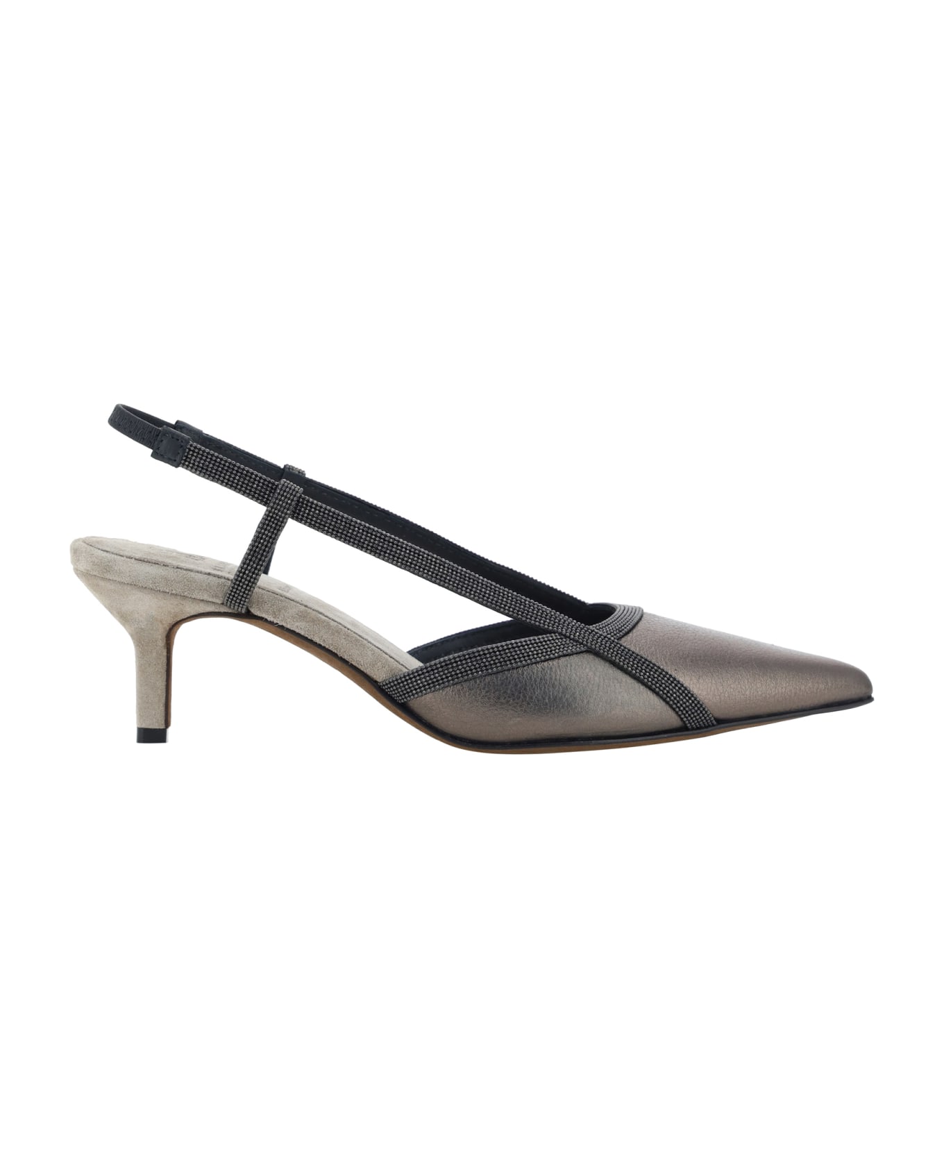 Calfskin pumps by brunello cucinelli, a slingback model embellished with shiny jewels, an elongated toe, a suede-effect kitten heel, and a press-on logo insole. Composition: 100% % Calf Leather Bos Taurus, 100% % Calf Leather Bos Taurus