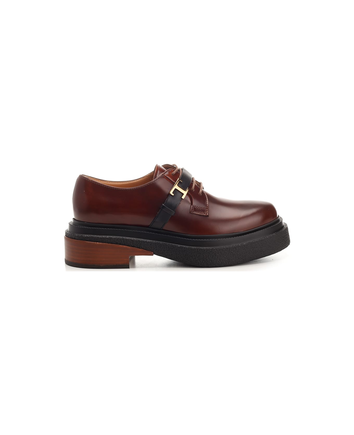 Semi-glossy leather lace-up with elegant upper, chunky light rubber sole and leather heel. Decorative front strap with Tod's iconic T Timeless accessory in metal. Composition: UPPER: 100% Leather; SOLE: Rubber, Wood