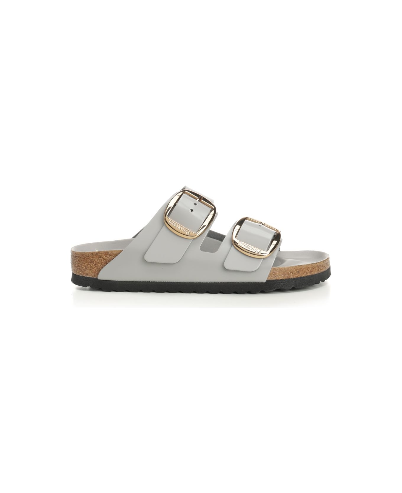 Grey leather "Arizona Big Buckle" sandal by Birkenstock with cork sole and two-strap closure with individually adjustable metal pin buckle.