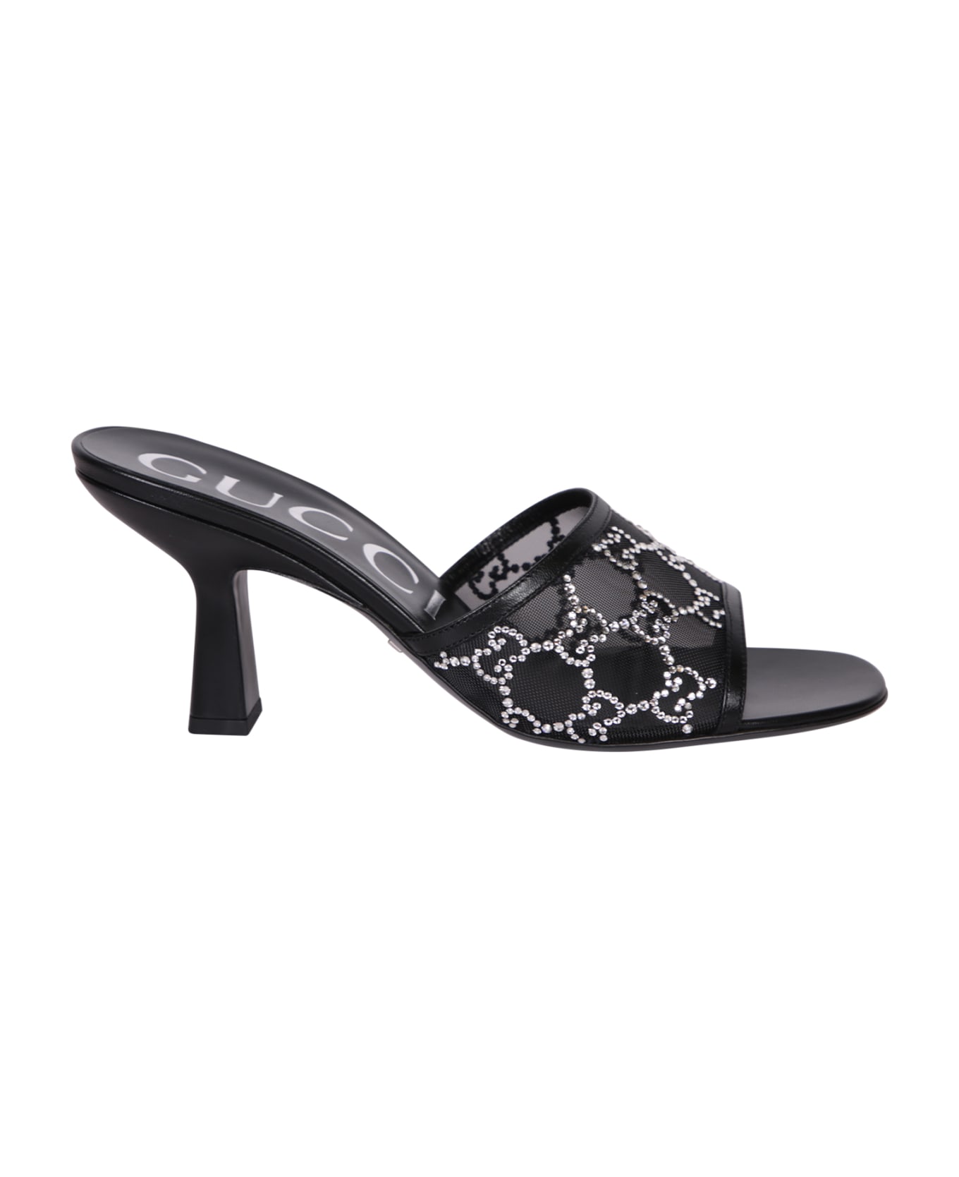 Round toe. Slip-on style. GG mesh with crystals. Branded insole. Leather sole. Medium heel. Color: black