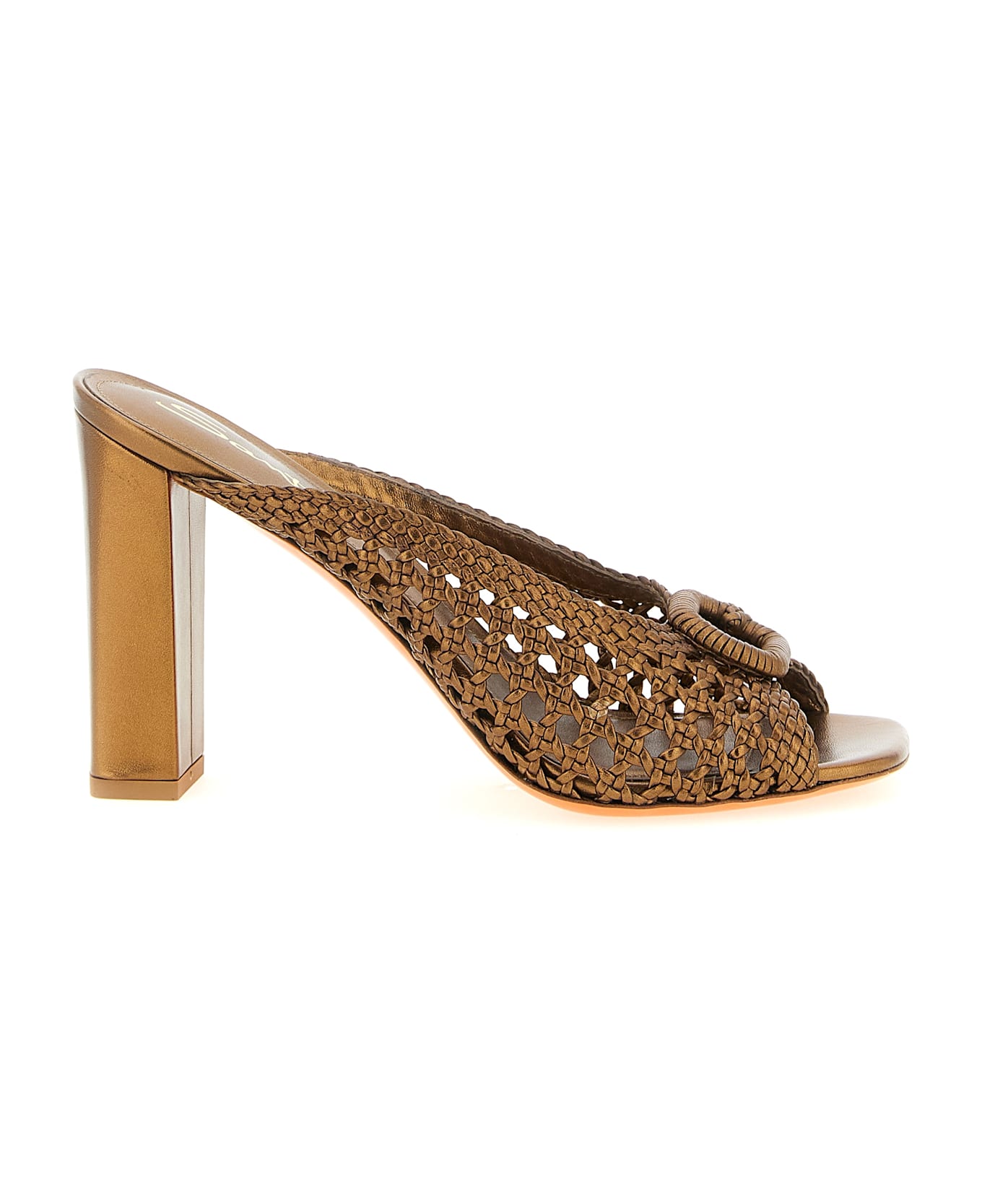 'Luce' sandals in fine woven nappa leather with wide weave, square toe with iconic covered Santoni buckle, wide heel and leather sole.