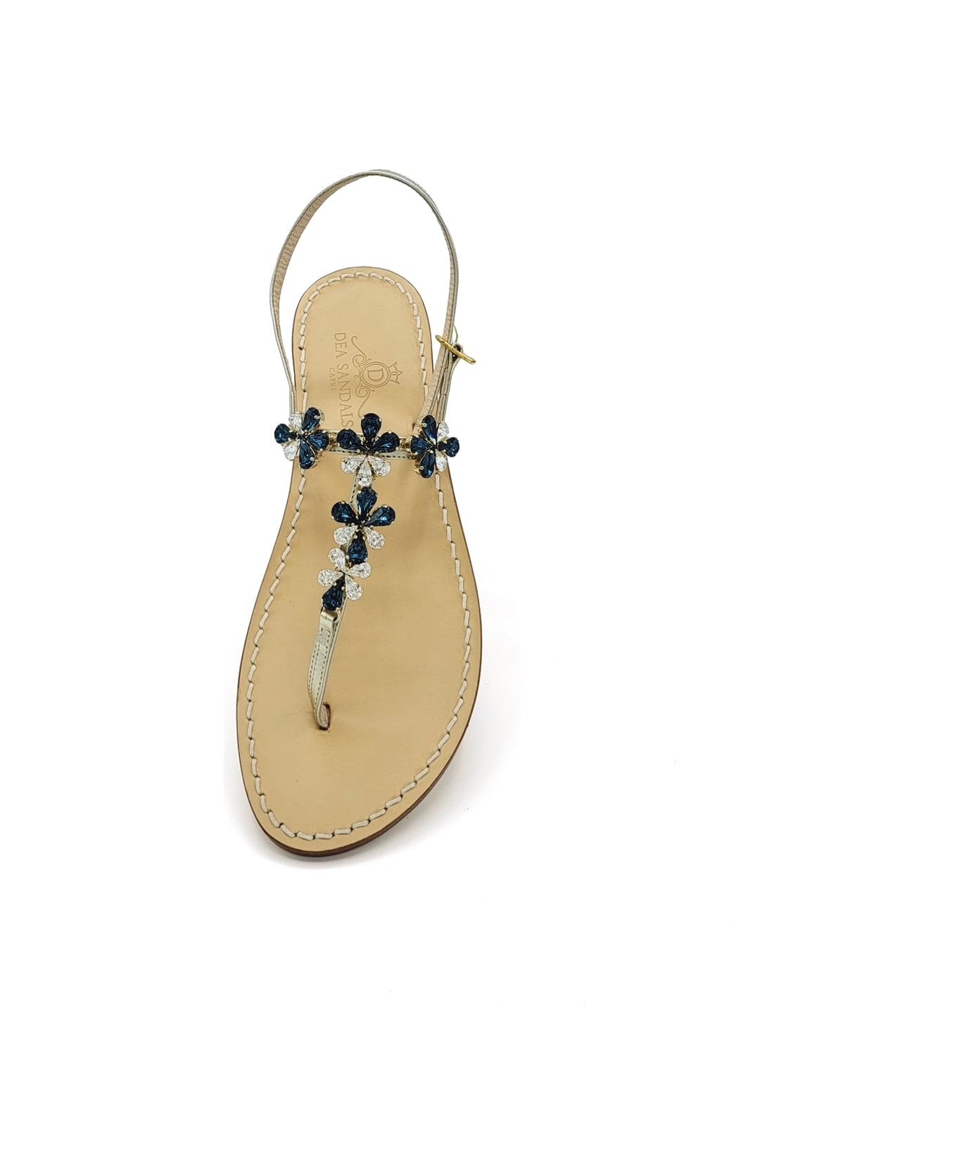 Navy Blue Narcissus Jewel Sandals with platinum laminated leather straps, natural leather sole, leather heel, jewel accessory with navy blue and natural crystal crystals. Accessory with Swarovski Crystals with guarantee certificate.