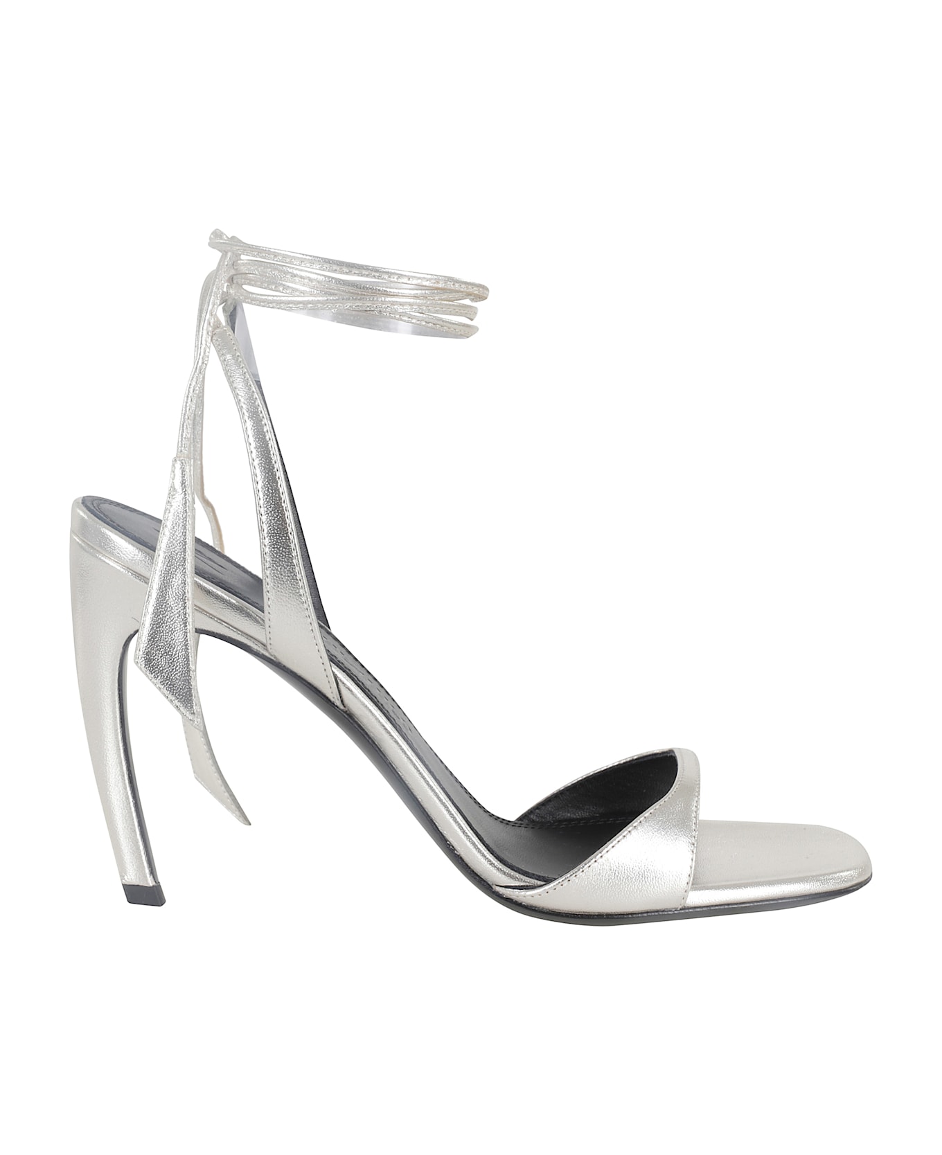 Category: Footwear Article: Now sandal Brand: The attic Color: Silver Details: Nappa leather thin laces Outsole: Leather Toe: Open with rounded team design Heel: Stiletto with curved profile