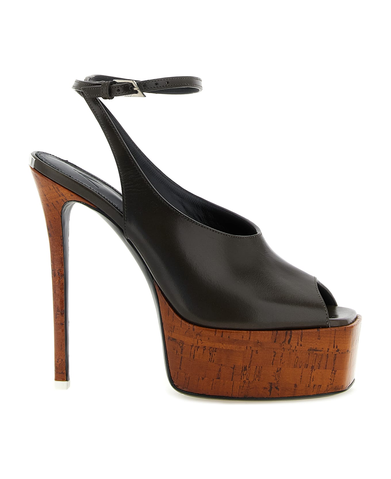 'Ornella' leather sandals with square toe, adjustable ankle strap, platform and polished cork-effect heel, stiletto heel, metal plaque with logo engraved on the heel, leather sole. Composition: 80% calfskin leather 20% cork