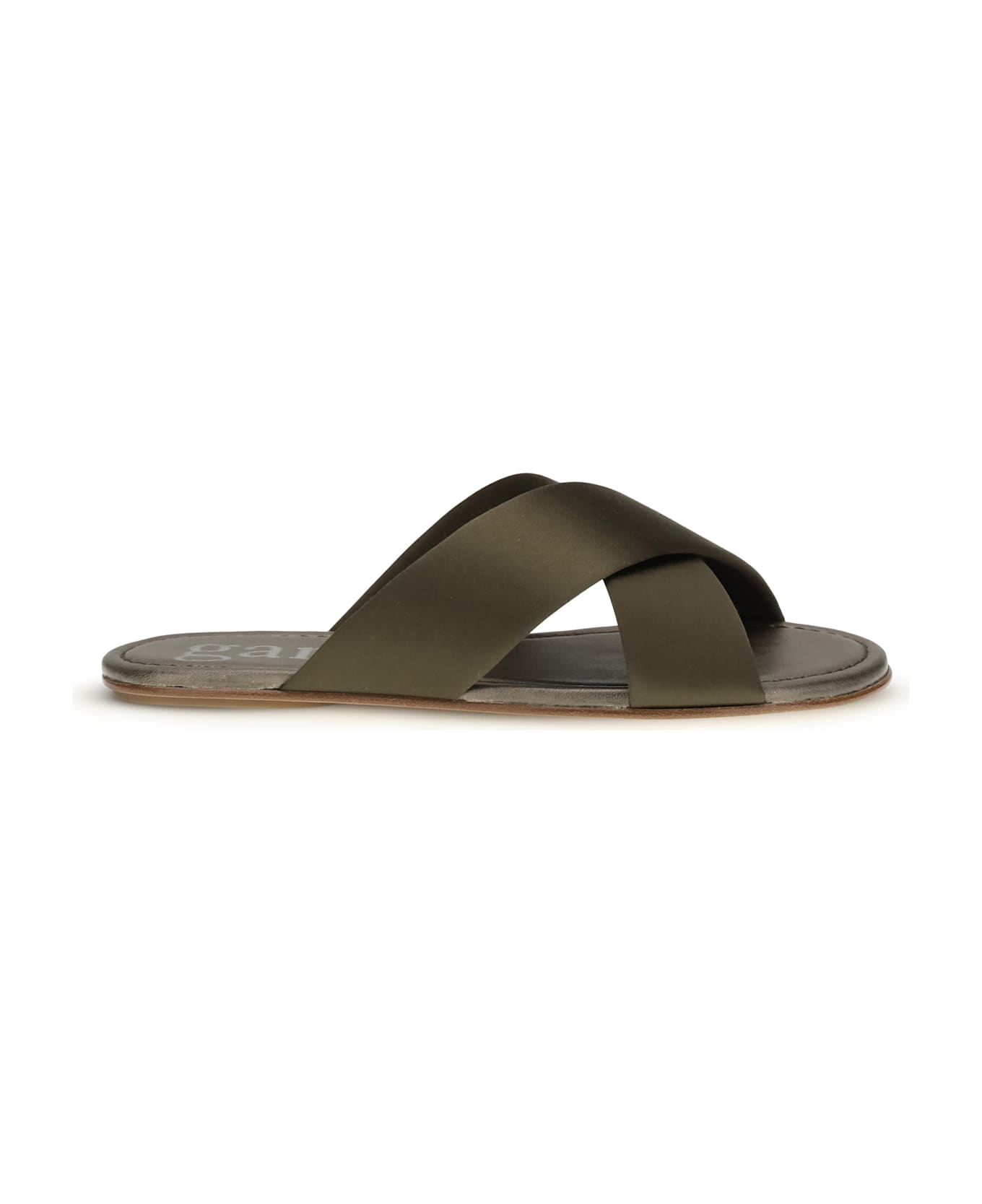 The pavana sandals by pedro garcia is an elegant olive silk satin flat slide featuring crossover straps that wrap the foot with effortless sophistication. expertly crafted in spain, it transitions seamlessly from daytime wear to evening looks and is finished with the brand s signature anti-slip tpu sole. Composition: 100% % Silk, 100% % Calf Leather Bos Taurus