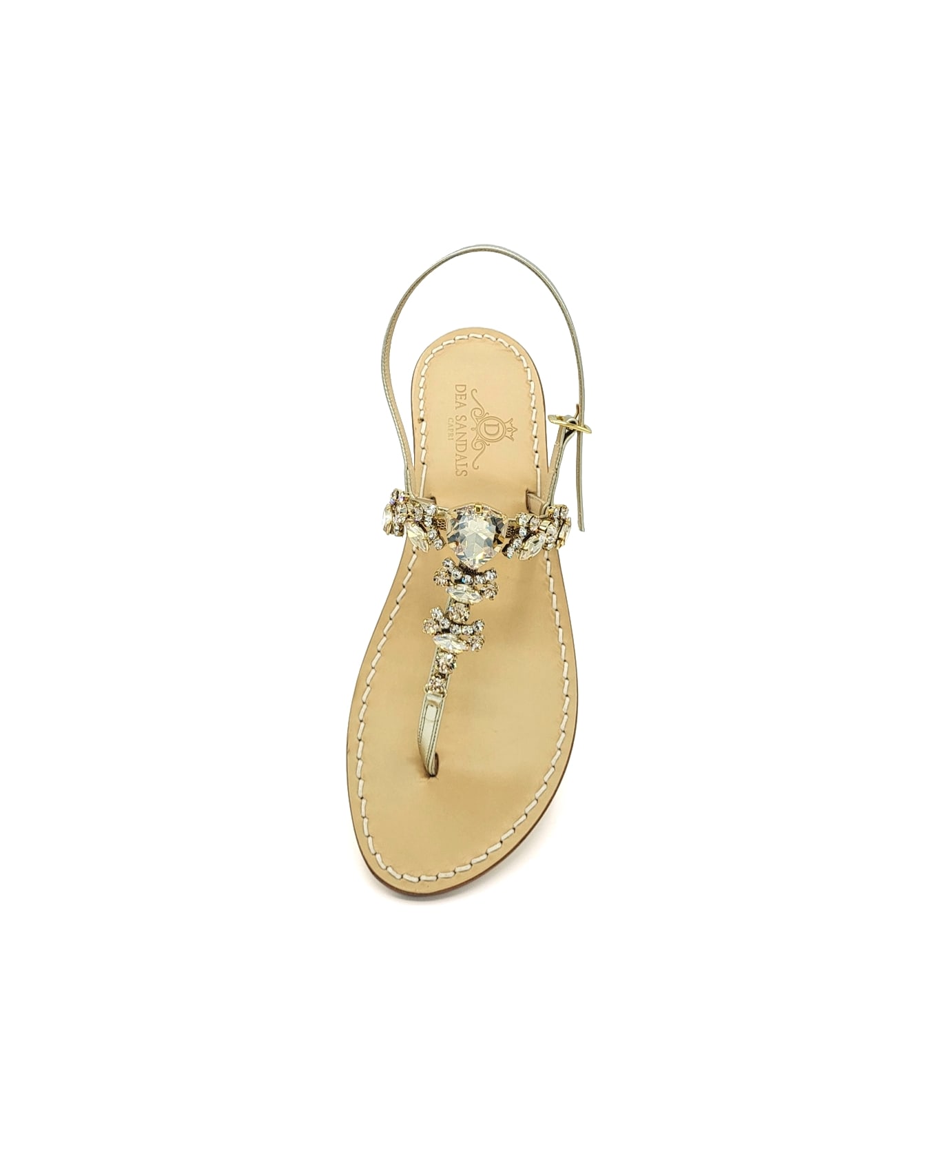 Serapide Amber Jewel Sandals with platinum laminated leather straps, natural leather sole, leather heel, jewel accessory with Amber and natural crystals. Accessory with Swarovski Crystals with guarantee certificate.
