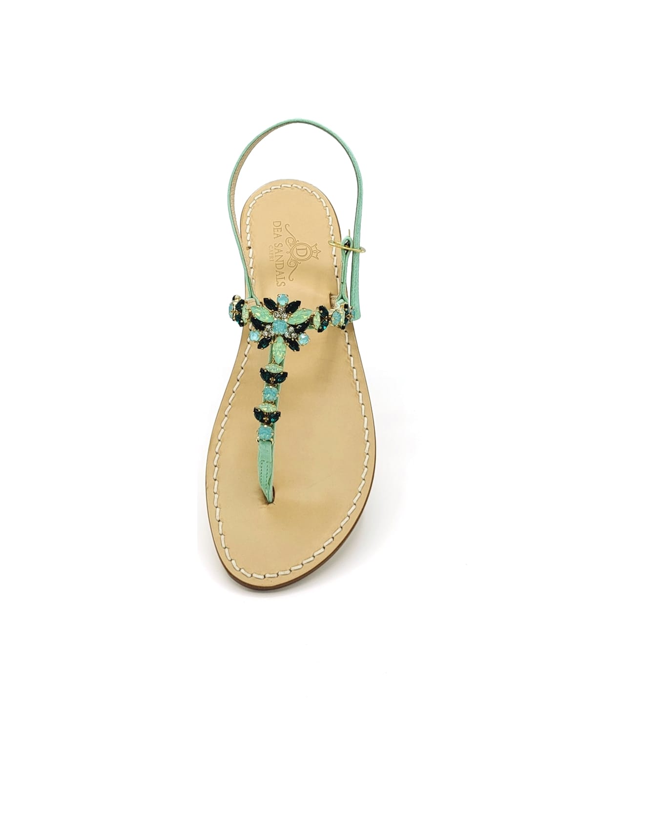 Viale Botteghe Green Sandals in aqua green suede, natural leather sole, leather heel, jewel accessory with aqua green, dark green and natural crystal crystals. Accessory with Swarovski Crystals with guarantee certificate.