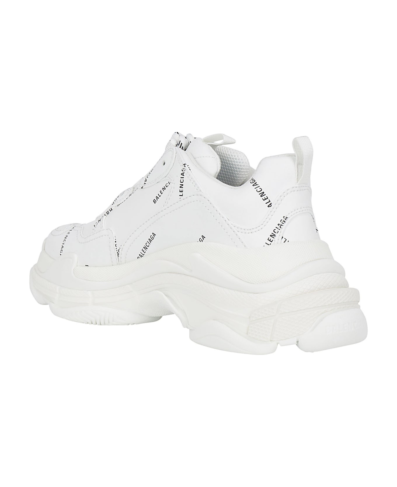 Triple S Sneakers by Balenciaga, structured sole, black and white lace up closure, logo printed all over, embroidered brand logo on side, embroidered size number at toe, leather details, brand logo on sole and insole.