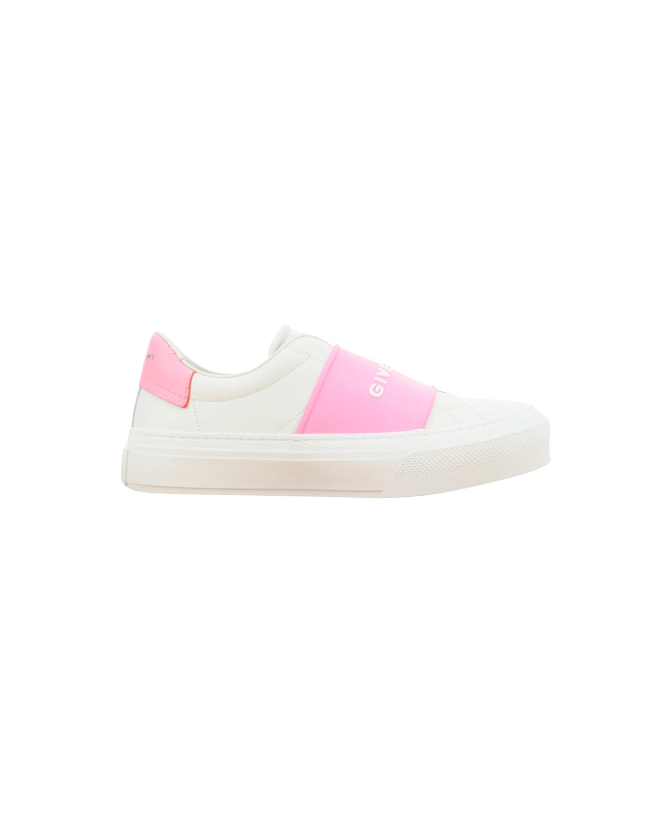 Calfskin city sport sneakers by givenchy, round toe, flat rubber sole, wide contrasting leather band appliqué on front and logoed, slip-on style, iconic brand monogram press-stamped on back tongue.