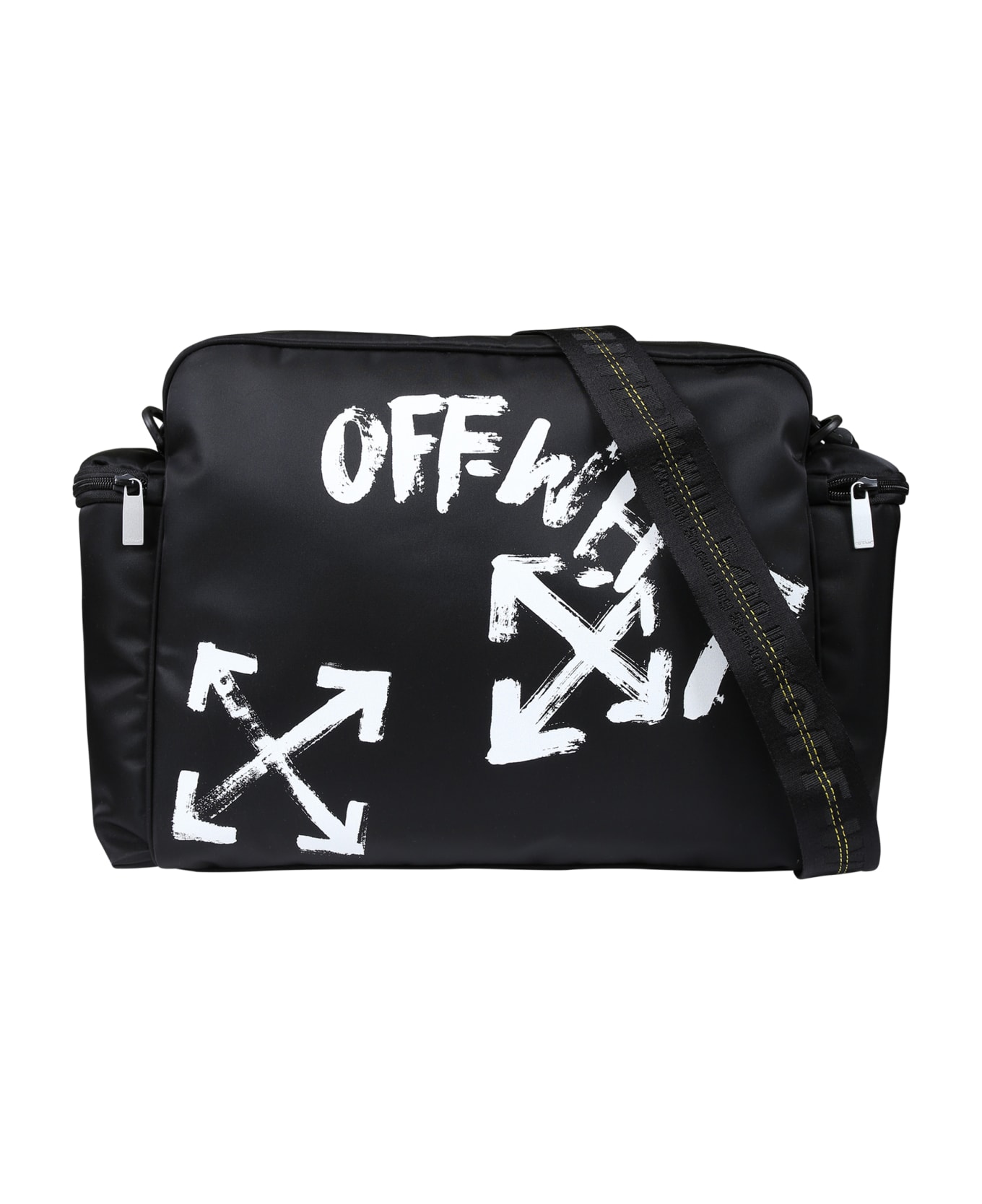 Black changing bag, made from techical fabric, with adjustable shoulder strap with yellow stitching and logo, zipper fasteing and side thermal pockets with zip; it is embellished with white logo and iconic arrow printe on one side. Size 40 x 27 x 15,5 cm.
