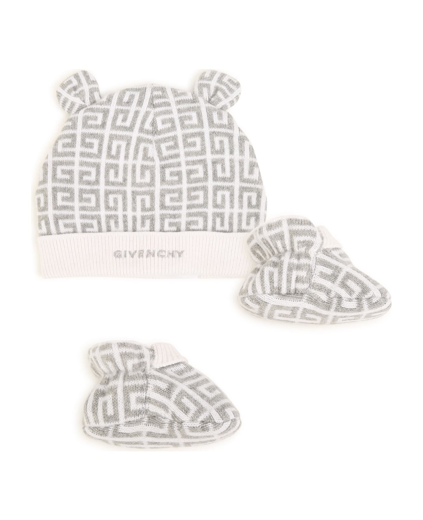 4G-jacquard knitted hat set from Givenchy Kids featuring medium grey, white, cotton-cashmere blend, knitted construction, signature 4G motif, embroidered logo to the front, pop-up animal ears, turn-up brim, round crown and slip-on style.