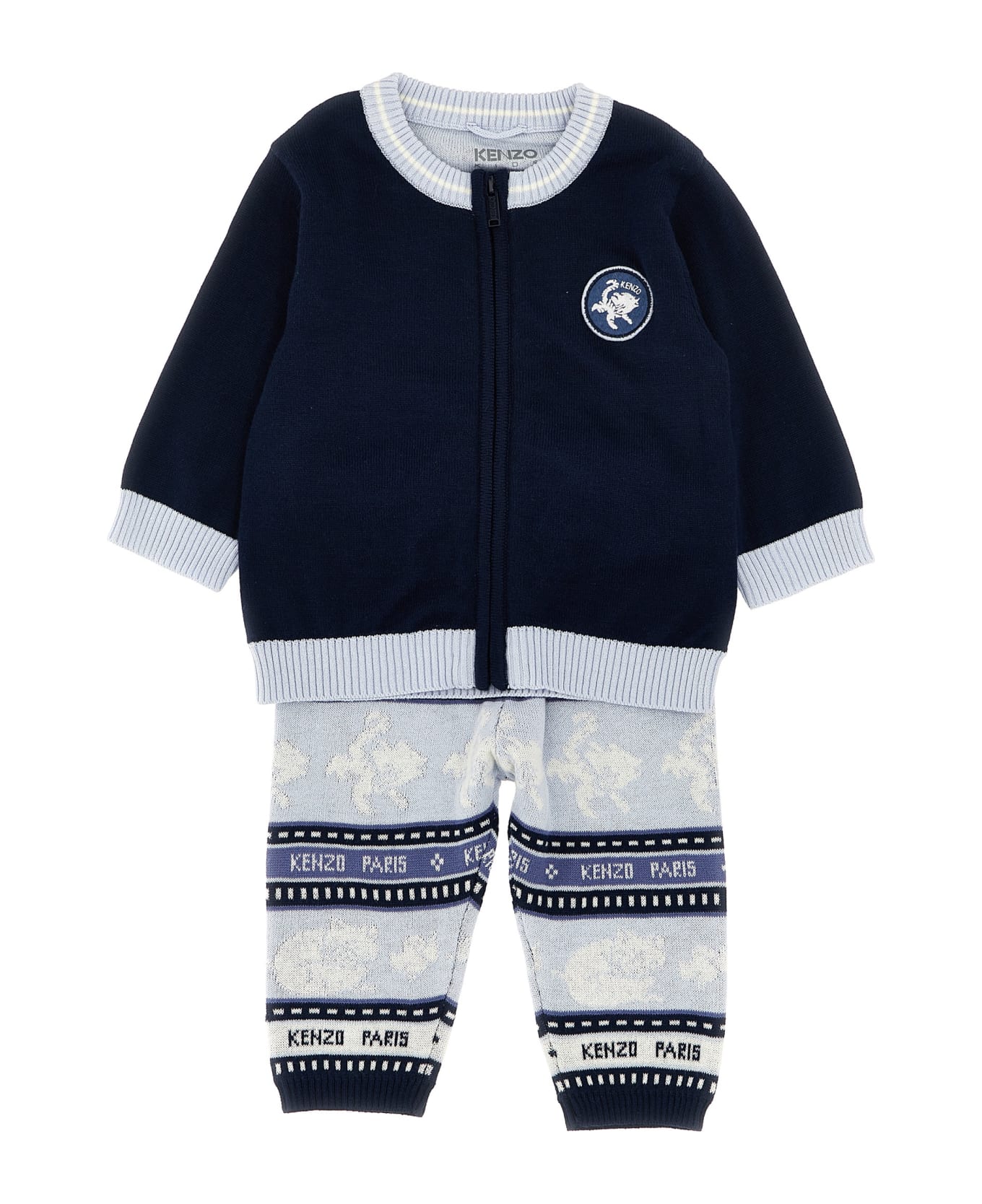 Cotton knit suit consisting of jacquard pattern, crewneck, long cuffed sleeves, leggings with all-over jacquard pattern, elastic waistband.