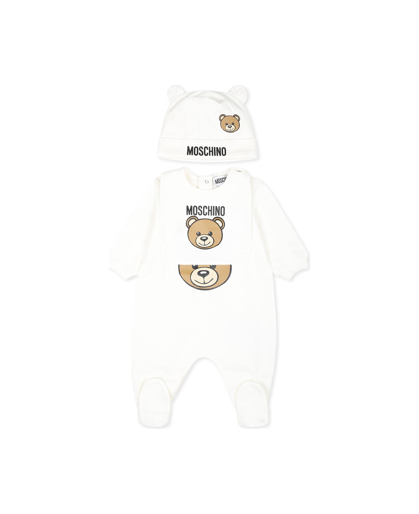 Ivory babygrow set from the Moschino kids brand, composed of a babygrow hat and bib. Babygrow in brushed cotton, long sleeves, with a peter pan collar, ribbed cuffs and snap button closure on the back. It is embellished with Teddy Bear and logo on the front. Hat with ears applied on the sides. It is embellished with a Teddy Bear print and black logo. Bib with side snap button closure, decorated with a Teddy Bear and black logo.