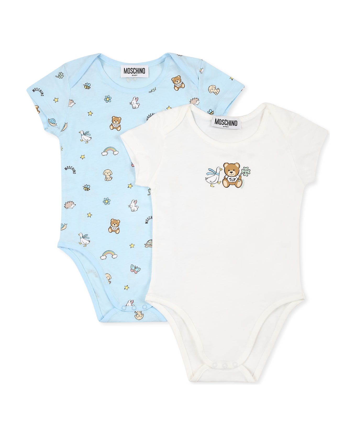 Ivory body set, in cotton, composed of two bodies, ivory and light blue, with short sleeves, with ribbed crew neck and press studs between the legs. The light blue body is embellished with Teddy Bear and multicolor all-over prints; the ivory body is embellished with Teddy Bear and goose, on the front.