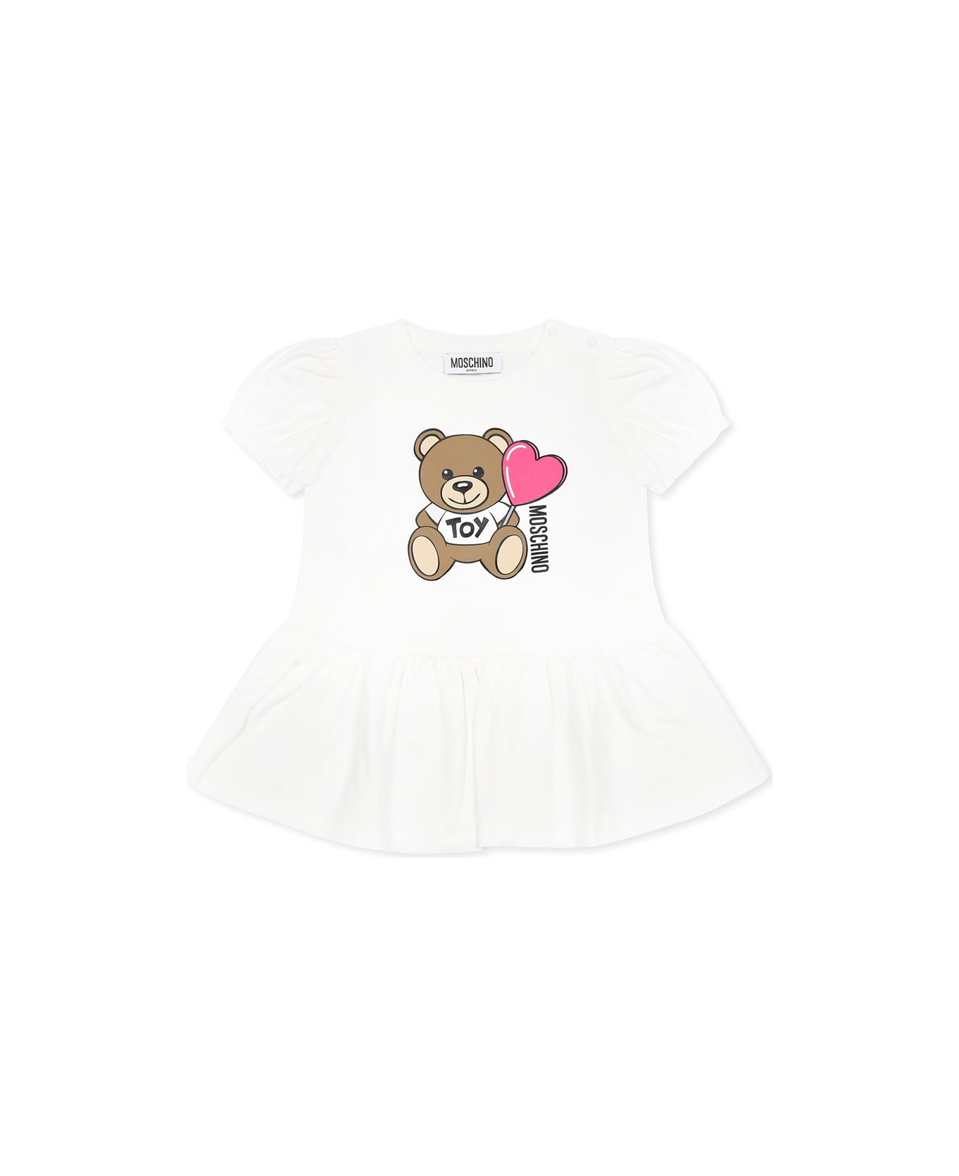 Ivory dress from the Moschino Kids brand, in a cotton blend, with short balloon sleeves, a ribbed crew neck, a snap button fastening on the shoulder and a flounce at the bottom. It is embellished with Teddy Bear, heart and logo on the front.