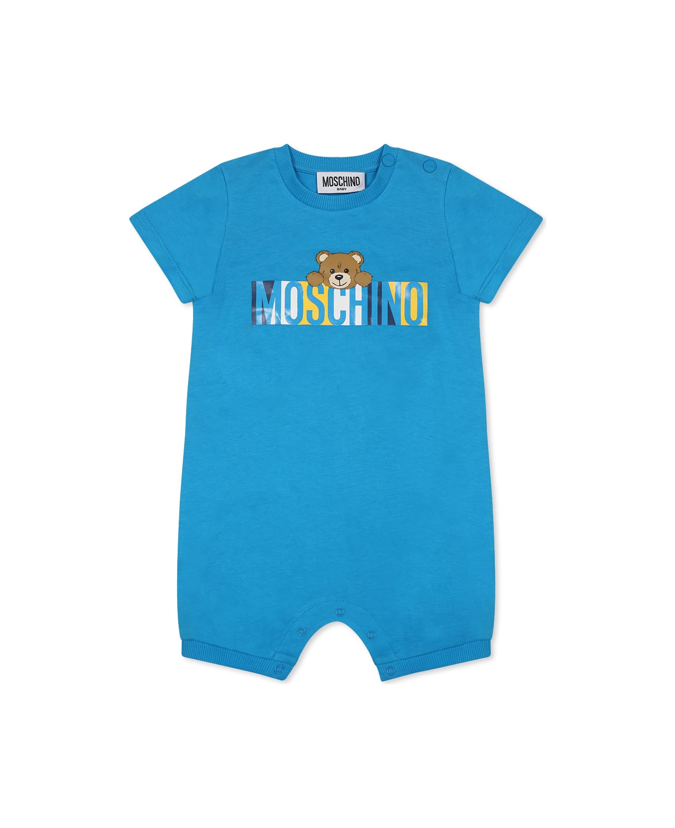 Light blue babygrow from the Moschino Kids brand, in cotton jersey, with short sleeves, ribbed crew neck, snap buttons on the shoulder and between the legs. It is embellished with Teddy Bear and multicolored logo printed on the front.