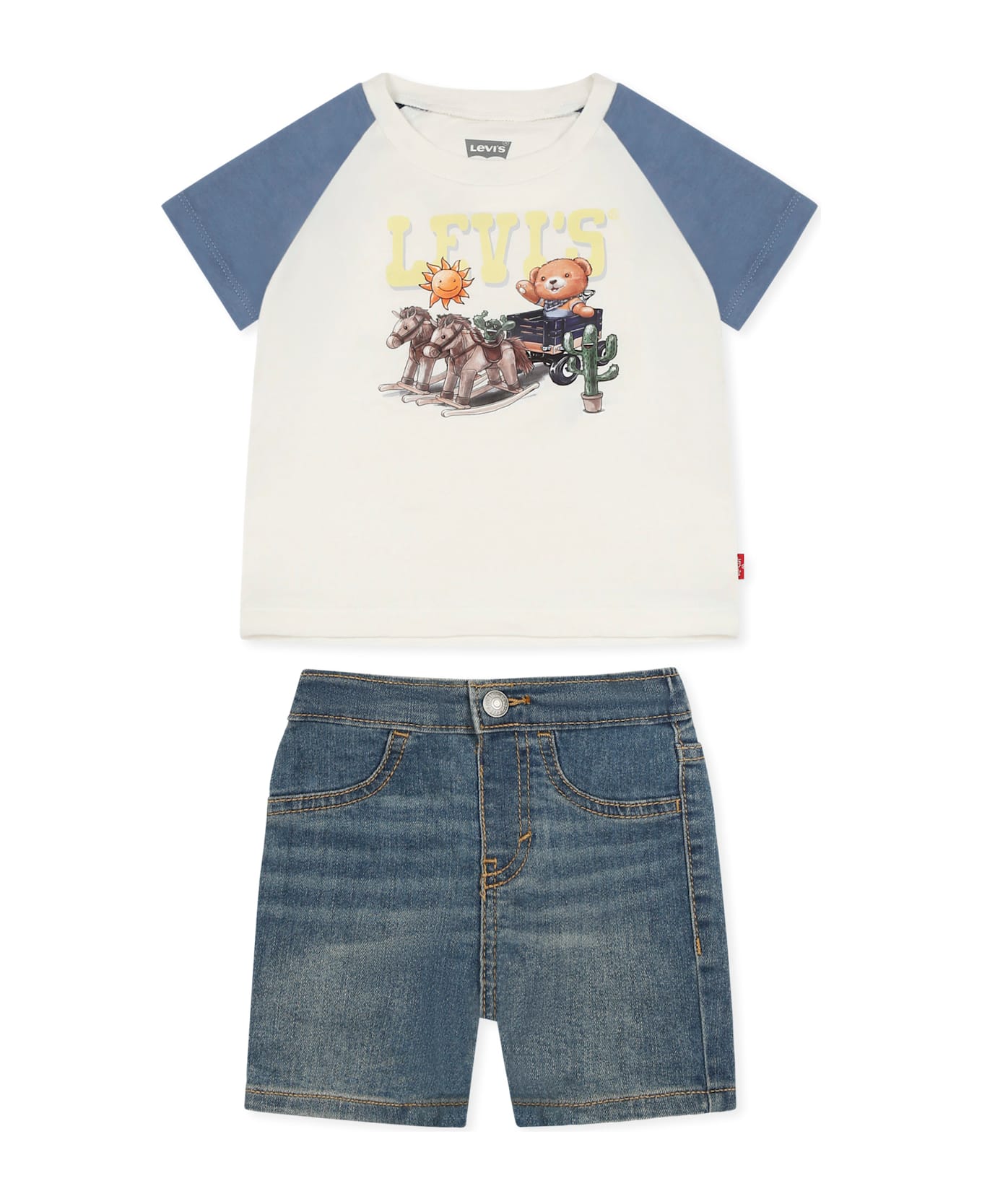 Multicolor suit composed of a t-shirt and shorts. White t-shirt with contrasting blue short sleeves, ribbed crew neck and snap button fastening on the back. It is embellished with logo and teddy bear print on the front. Denim shorts with zip and button fastening on the front, side pockets and pockets on the back.