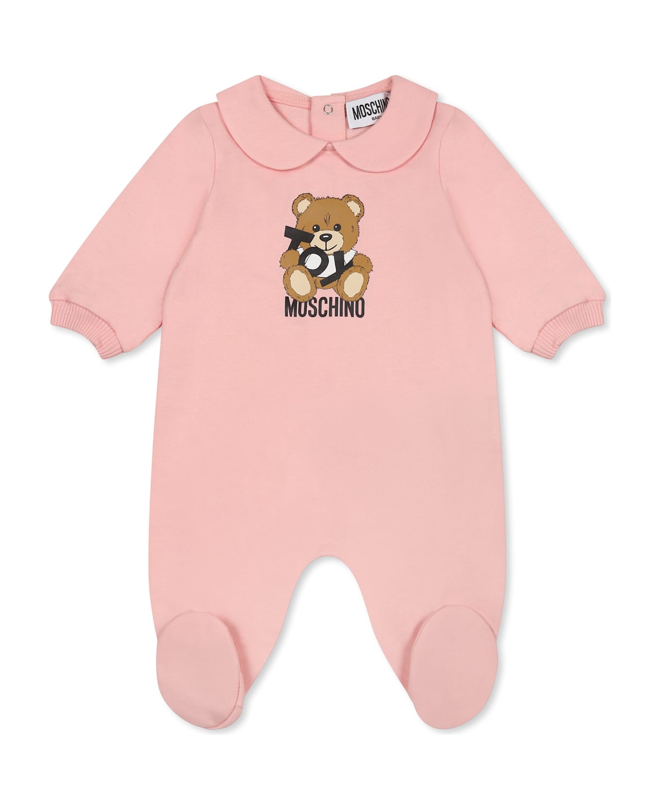 Pink babygrow from the Moschino Kids brand, in brushed cotton, with long sleeves, peter pan collar, snap button closure on the back, ribbed cuffs and feet. It is embellished with Teddy Bear, Toy writing and logo on the front.