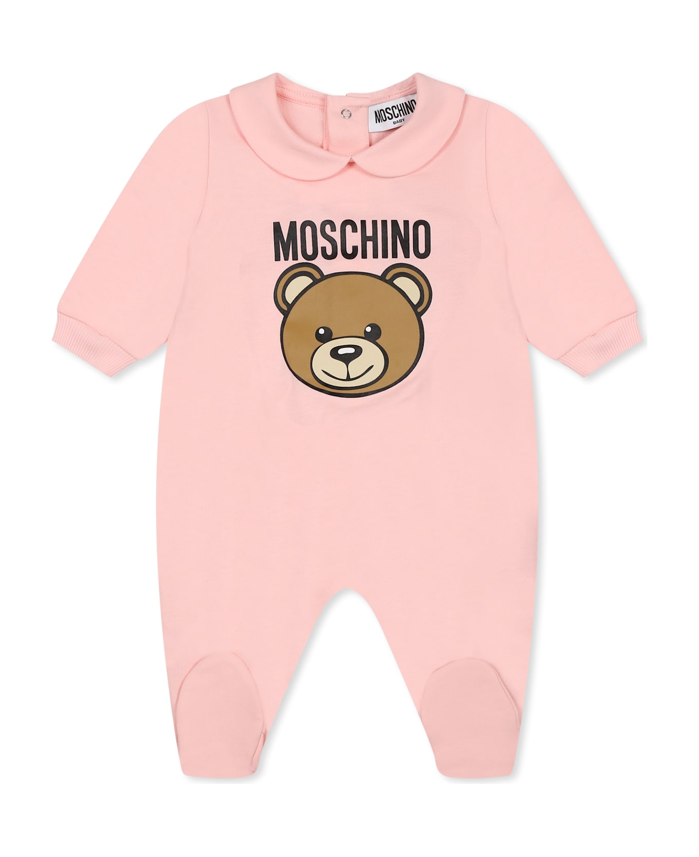 Pink babygrow from the Moschino Kids brand, made of soft cotton jersey. Brushed cotton cotton babygrow with long sleeves, a peter pan collar, feet and a snap button closure on the back. It is embellished with Teddy Bear and logo on the front..