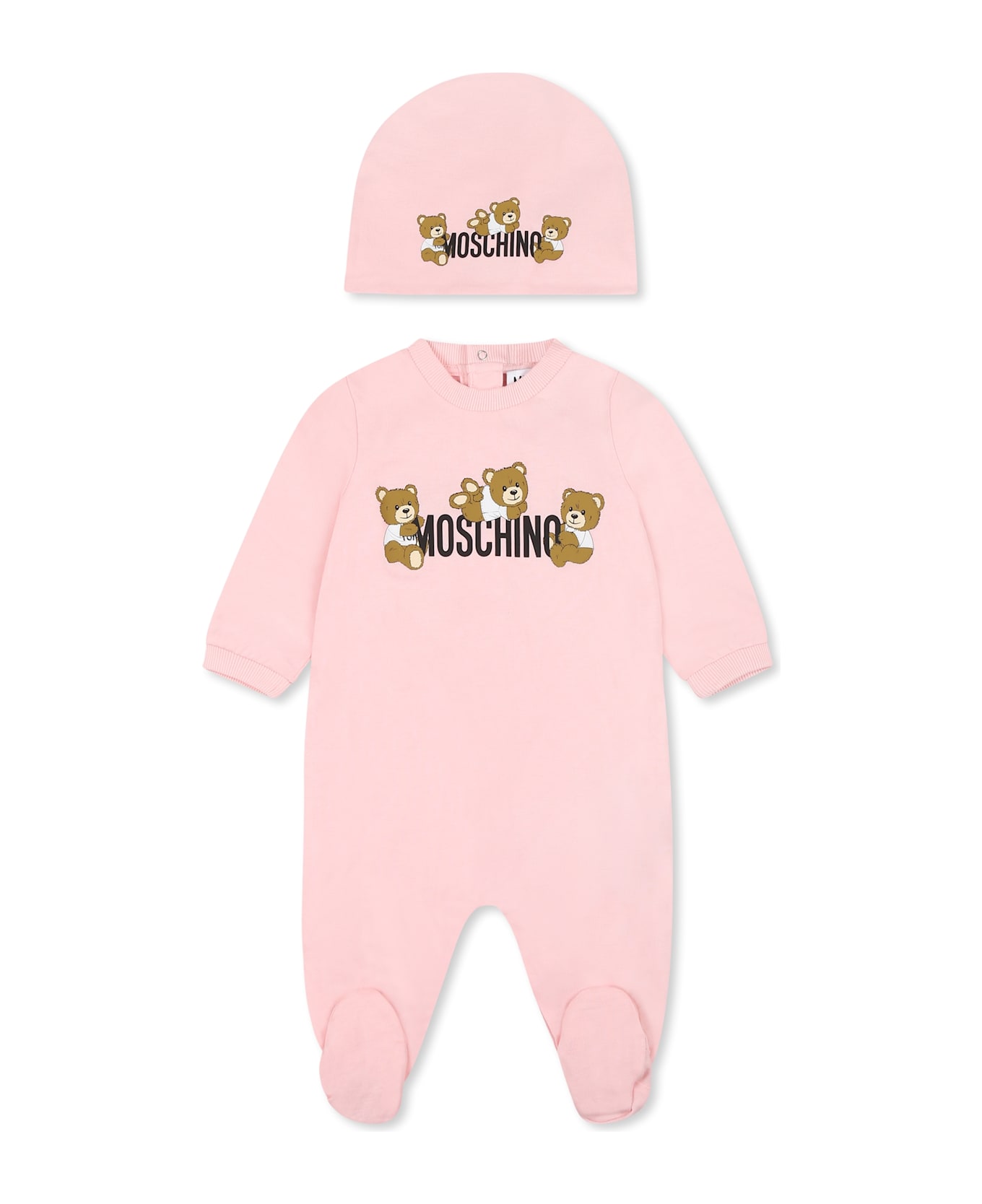 Pink babygrow set from Moschino Kids, in cotton, composed of babygrow and hat. Babygrow with long sleeves, ribbed crew neck, feet, snap button closure on the back and ribbed cuffs. It is embellished with three Teddy Bears and logo on the front.