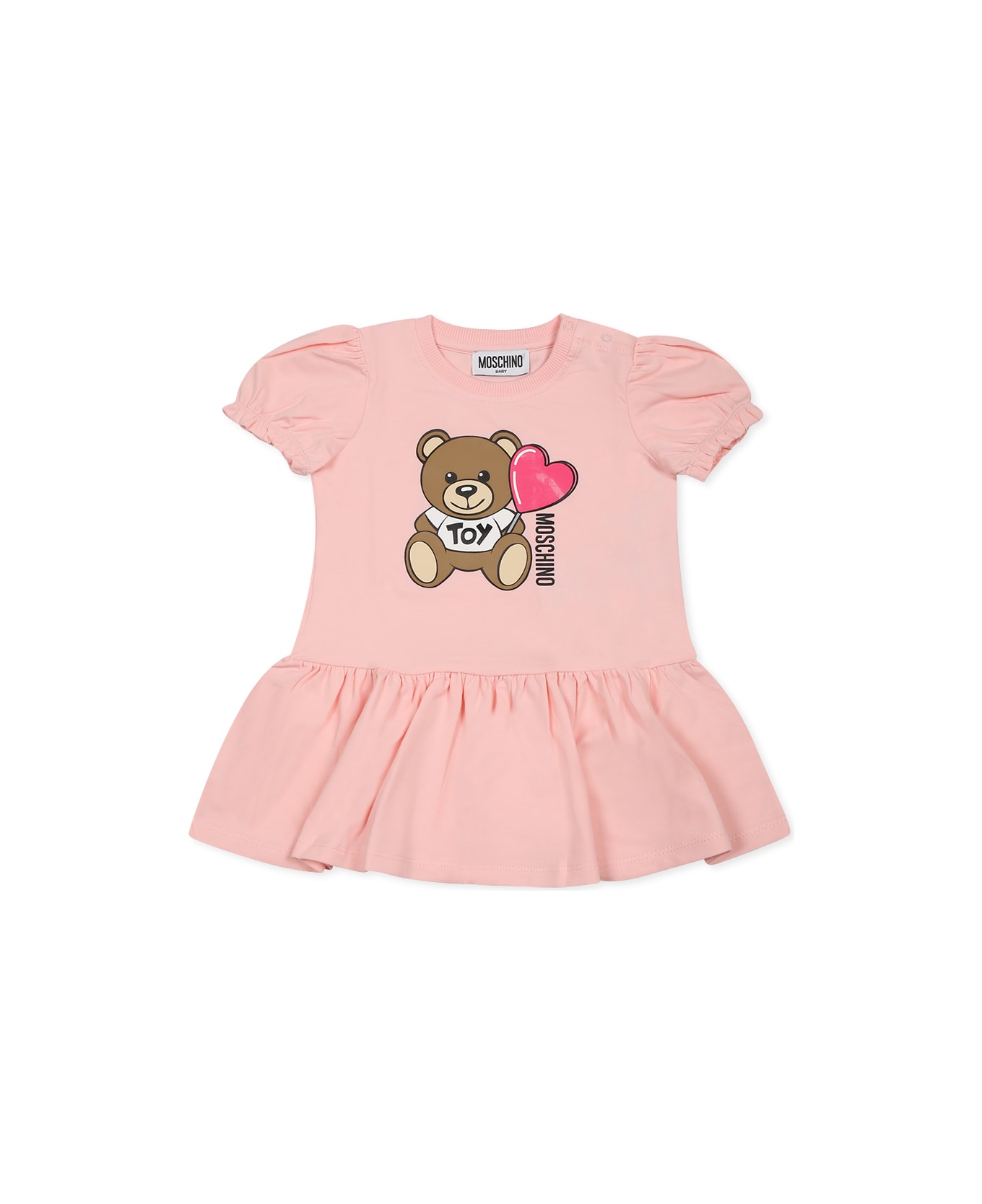 Pink dress from the Moschino Kids brand, in a cotton blend, with short balloon sleeves, a ribbed crew neck, a snap button fastening on the shoulder and a flounce at the bottom. It is embellished with Teddy Bear, heart and logo on the front.