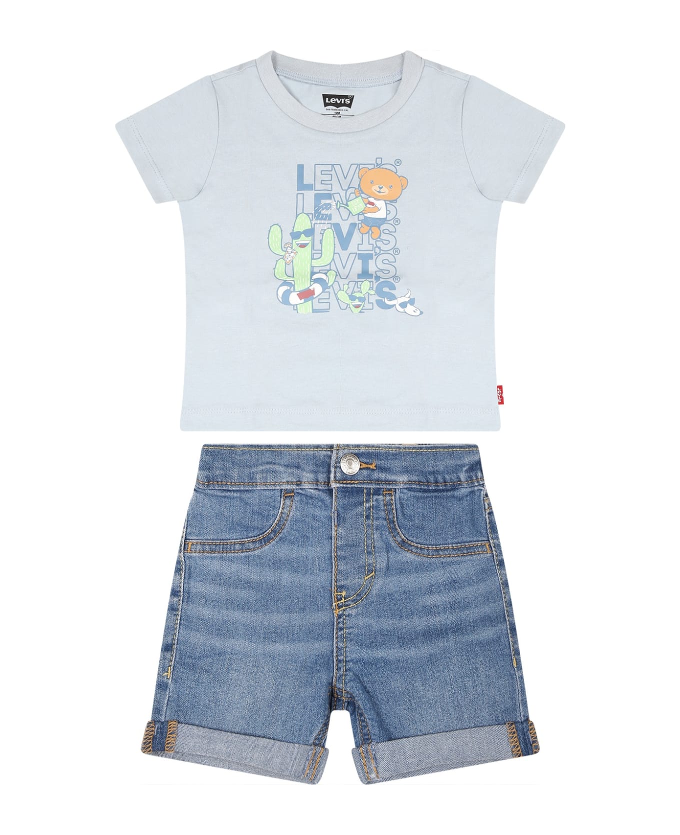 Multicolor suit composed of t-shirt and shorts. Light blue short-sleeved T-shirt with ribbed crew neck and snap button closure on the back. It is embellished with teddy bear, cactus and logo print on the front. Blue denim shorts with elastic on the back, front hook closure, patch pockets on the back and cuffed hems.
