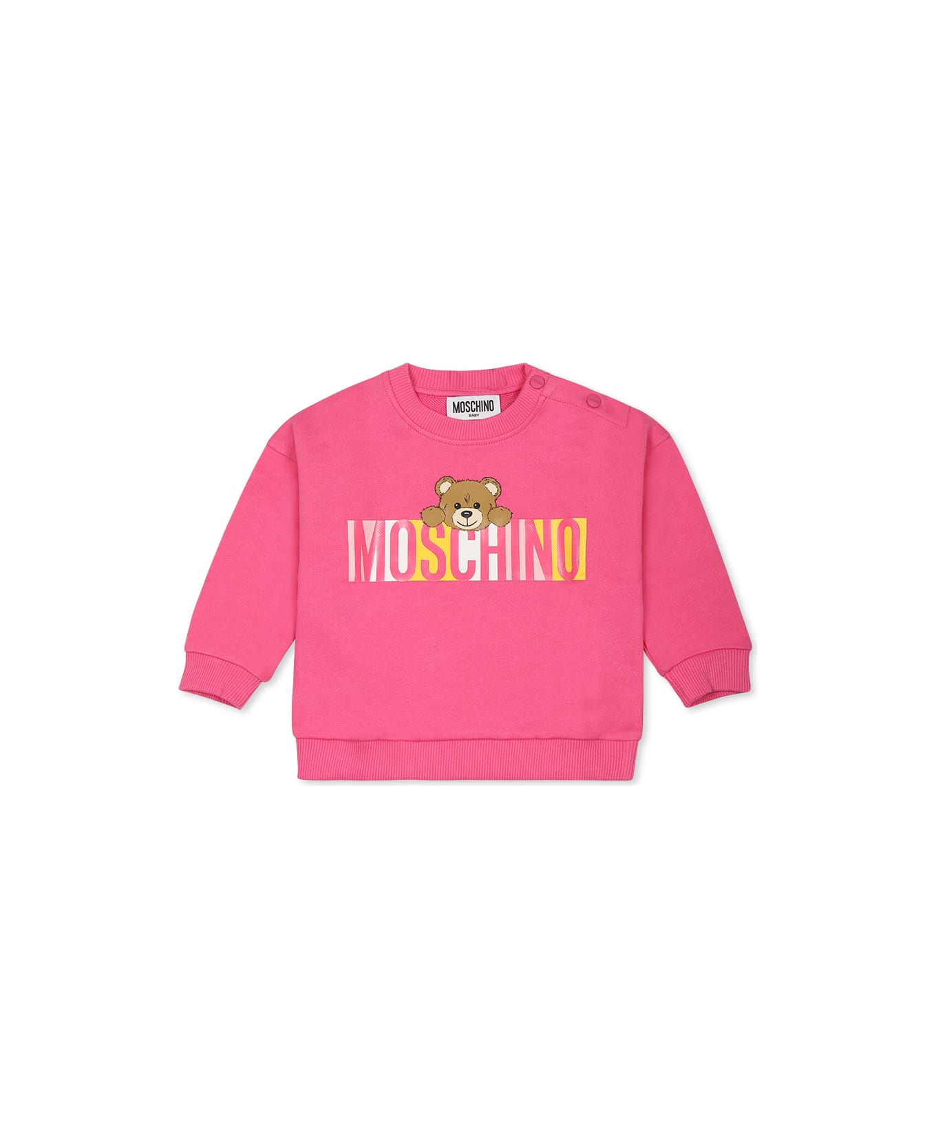 Fuchsia sweatshirt from the Moschino KIds brand, made of brushed cotton, with long sleeves, a crew neck, ribbed cuffs and hem and a snap button closure on the shoulder. It is embellished with Teddy Bear and multicolored logo printed on the front.