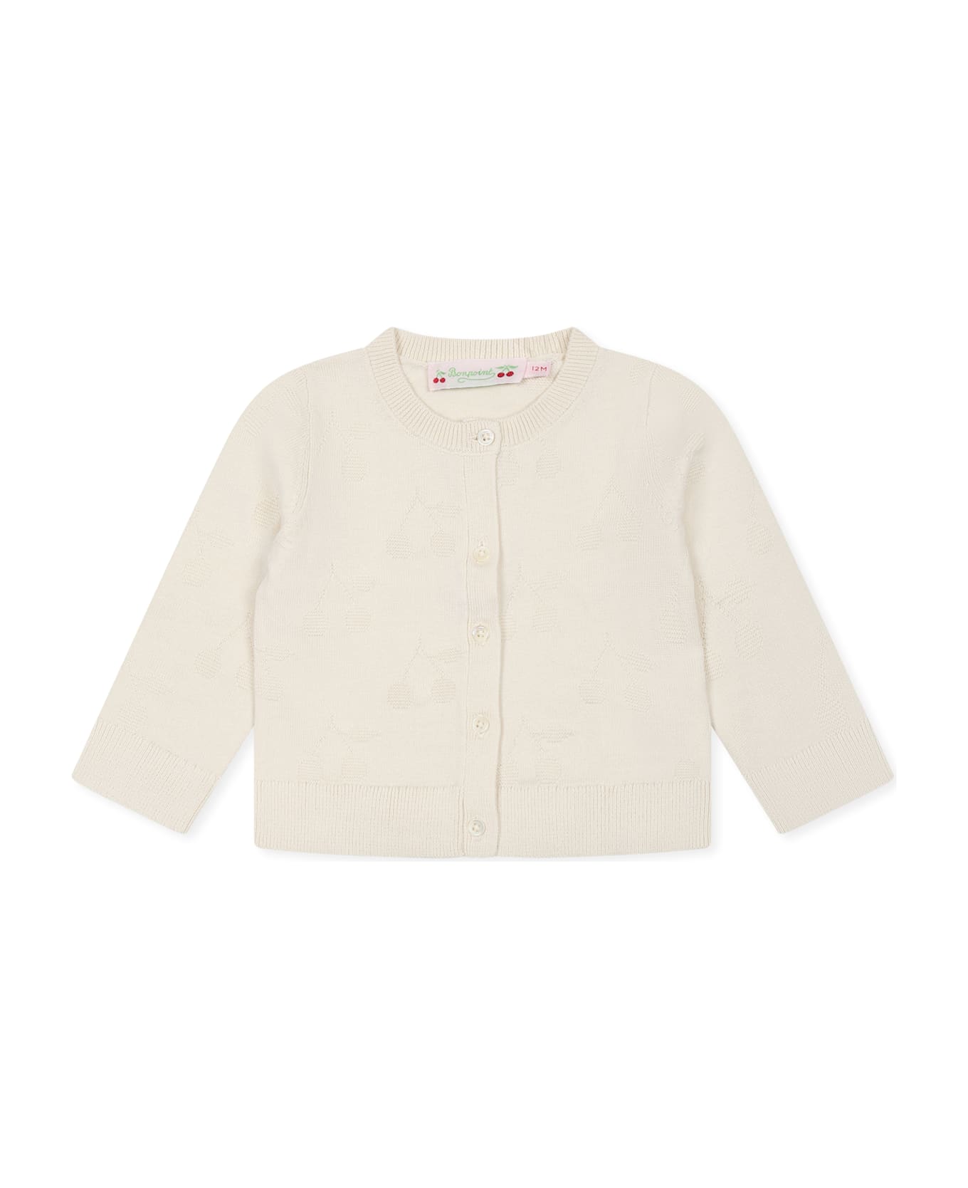 Ivory cotton cardigan, long sleeves, with ribbed crew neck, cuffs and hem and front button fastening. It is embellished with iconic all-over intarsia cherries.