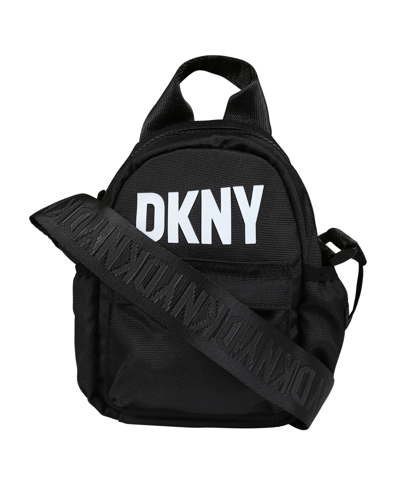 Black bag with handle, shoulder strap, top zip closure, front pocket and side pockets. It is embellished with white logo on the front and logo patch on the side. 19 x 17 x 7 cm.