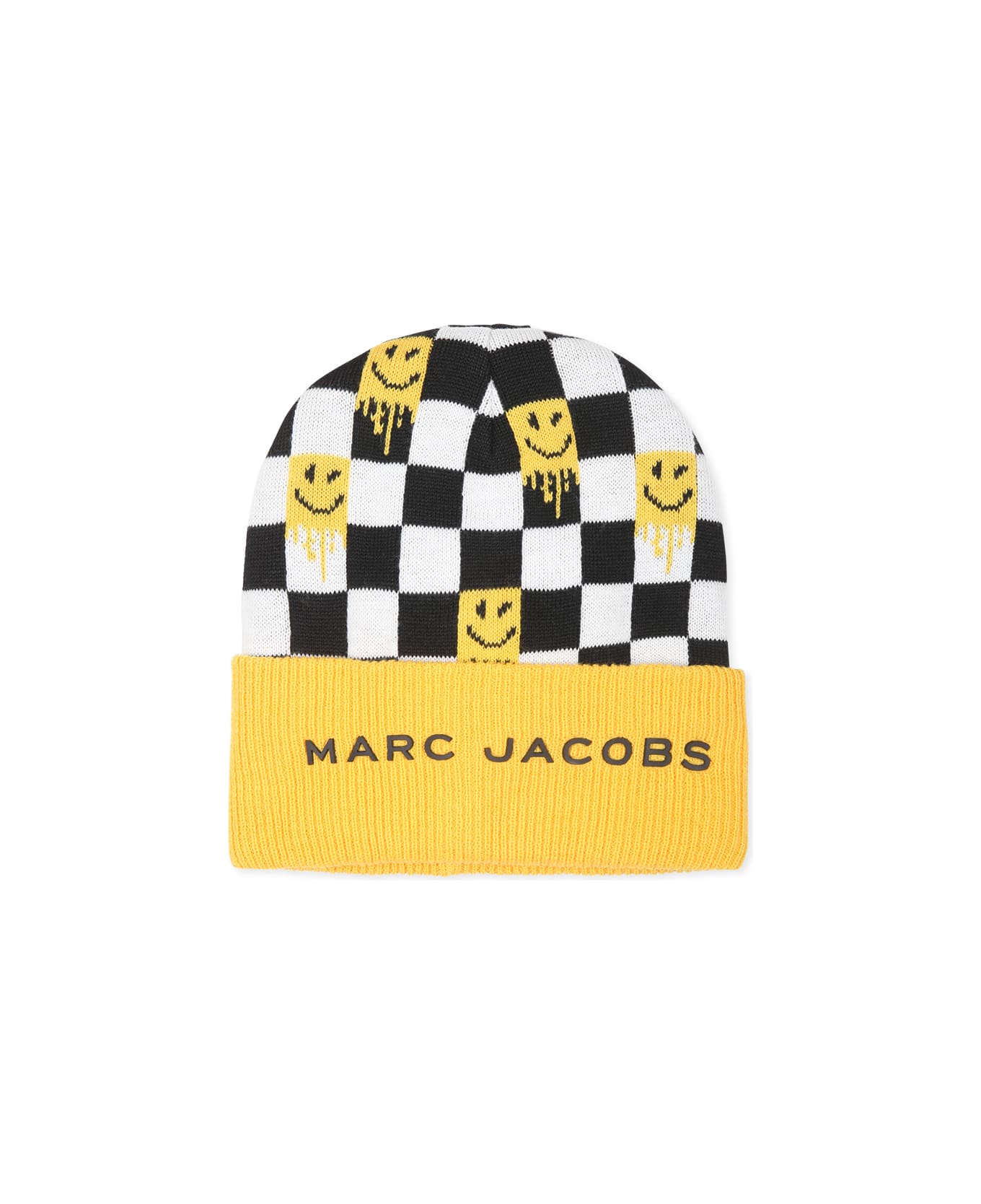 Yellow hat from the Marc Jacobs brand, with cuff. It is embellished with all-over checkered and smiley print and rubberized Marc Jacobs logo on the front. This item is a Smile World x Marc Jacobs collaboration.