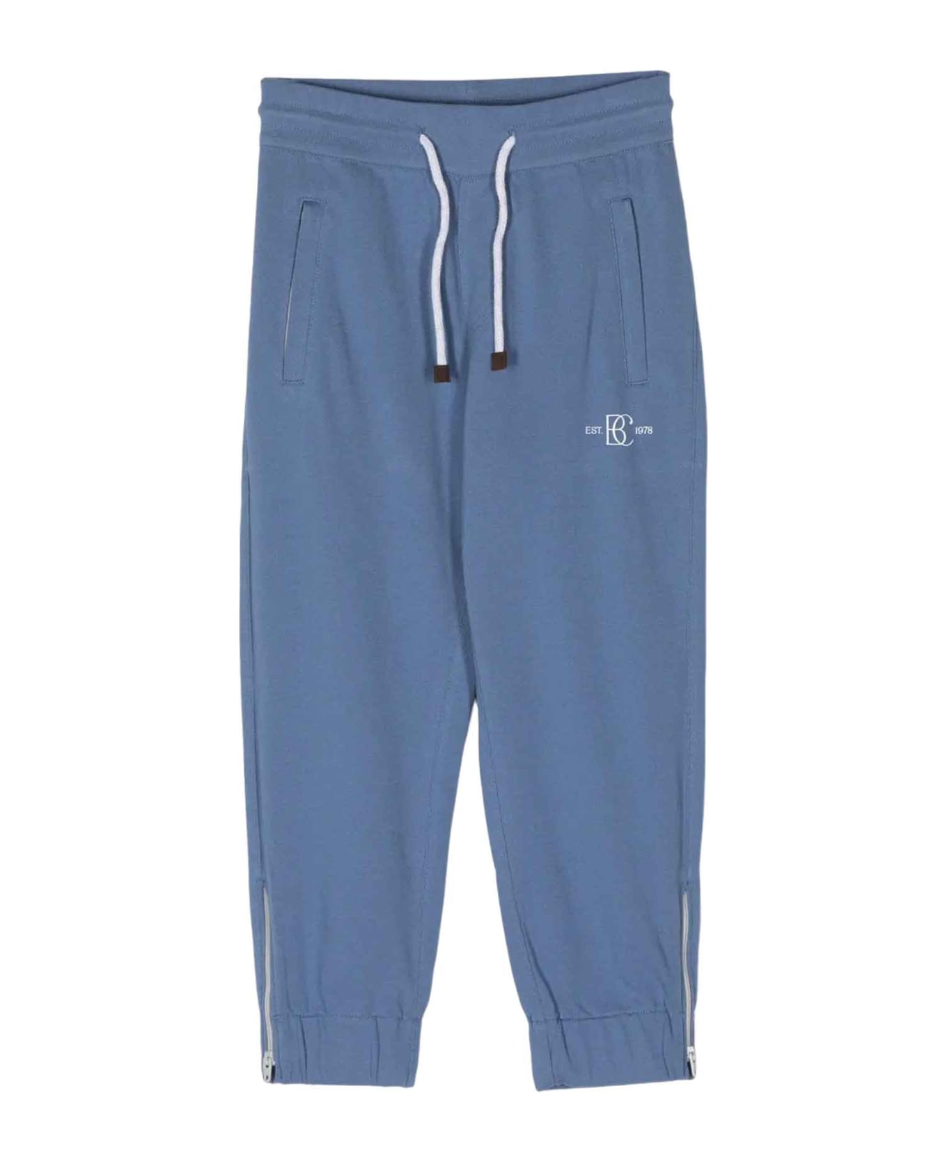 Blue trousers boy. Waist with elasticated drawstring, side print with logo, two side welt pockets and zip at the ankles. 100% Cotton