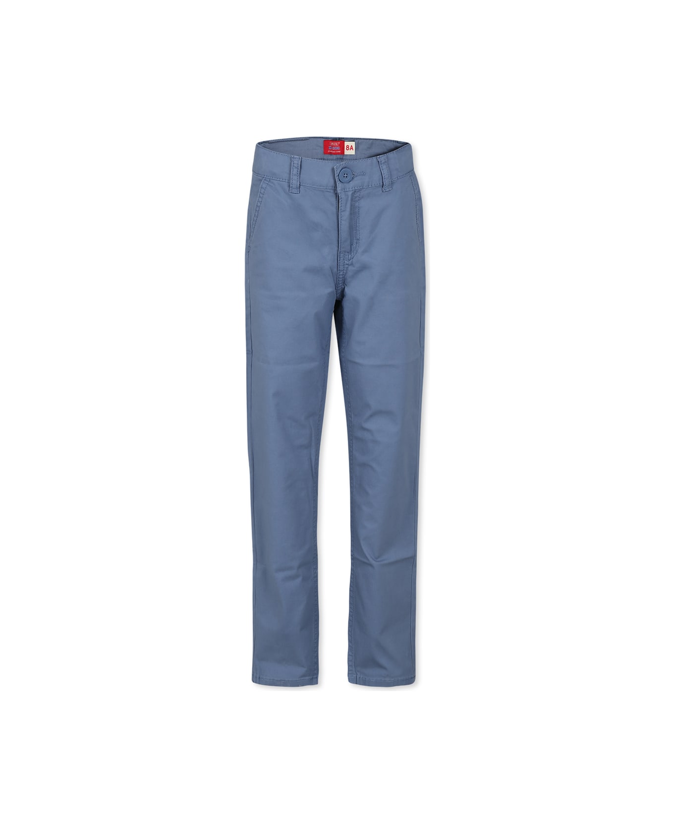 Blue trousers with belt loops, front zip and button closure, adjustable waist thanks to internal elastic with buttons, side welt pockets and pockets on the back. They are embellished with a logo patch on the back.
