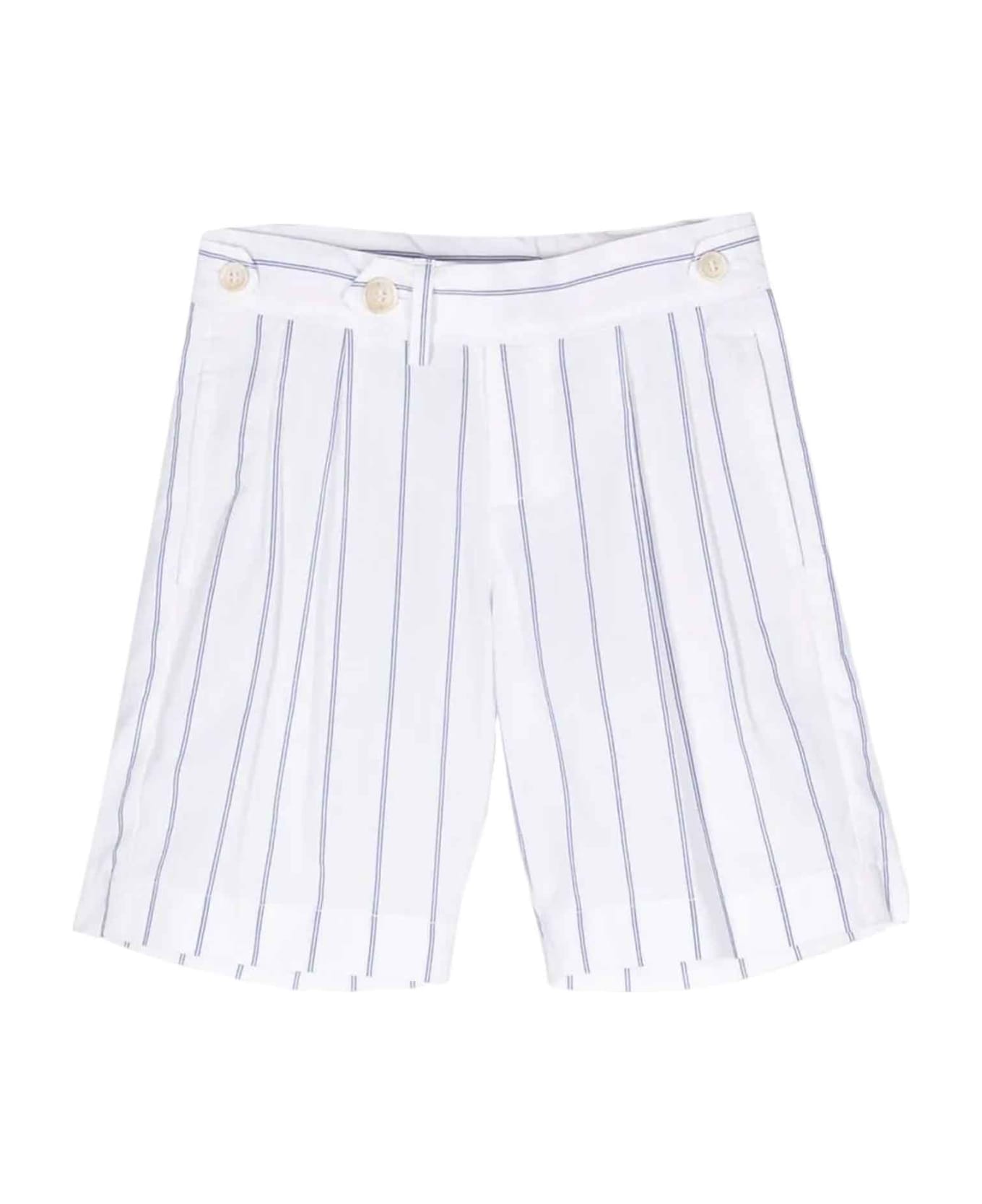 White shorts boy. Vertical striped motif, side button closure, two side welt pockets and two back welt pockets. 100% Cotton