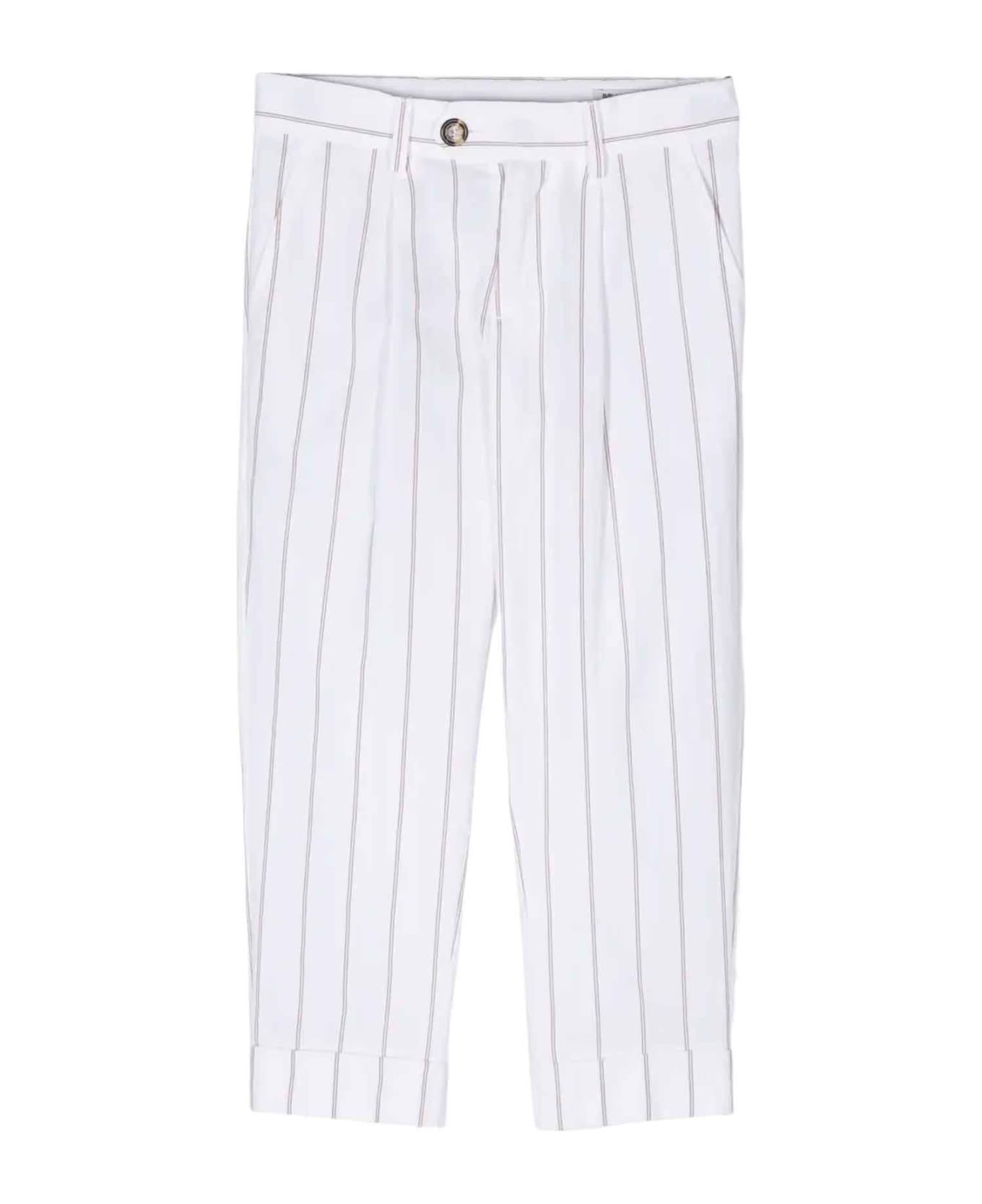 white trousers boy. Pinstripe motif, off-centre front closure with buttons, two side welt pockets and two hidden back pockets. 100% Cotton