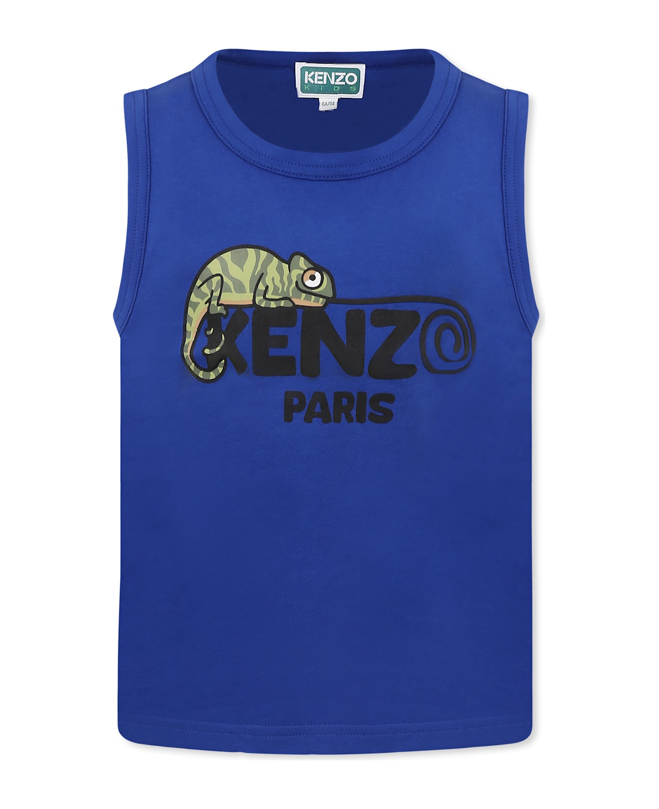 Blue tank top from the French brand Kenzo Kids, in organic cotton, sleeveless, with crew neck. It is embellished with gecko print and logo on the front.