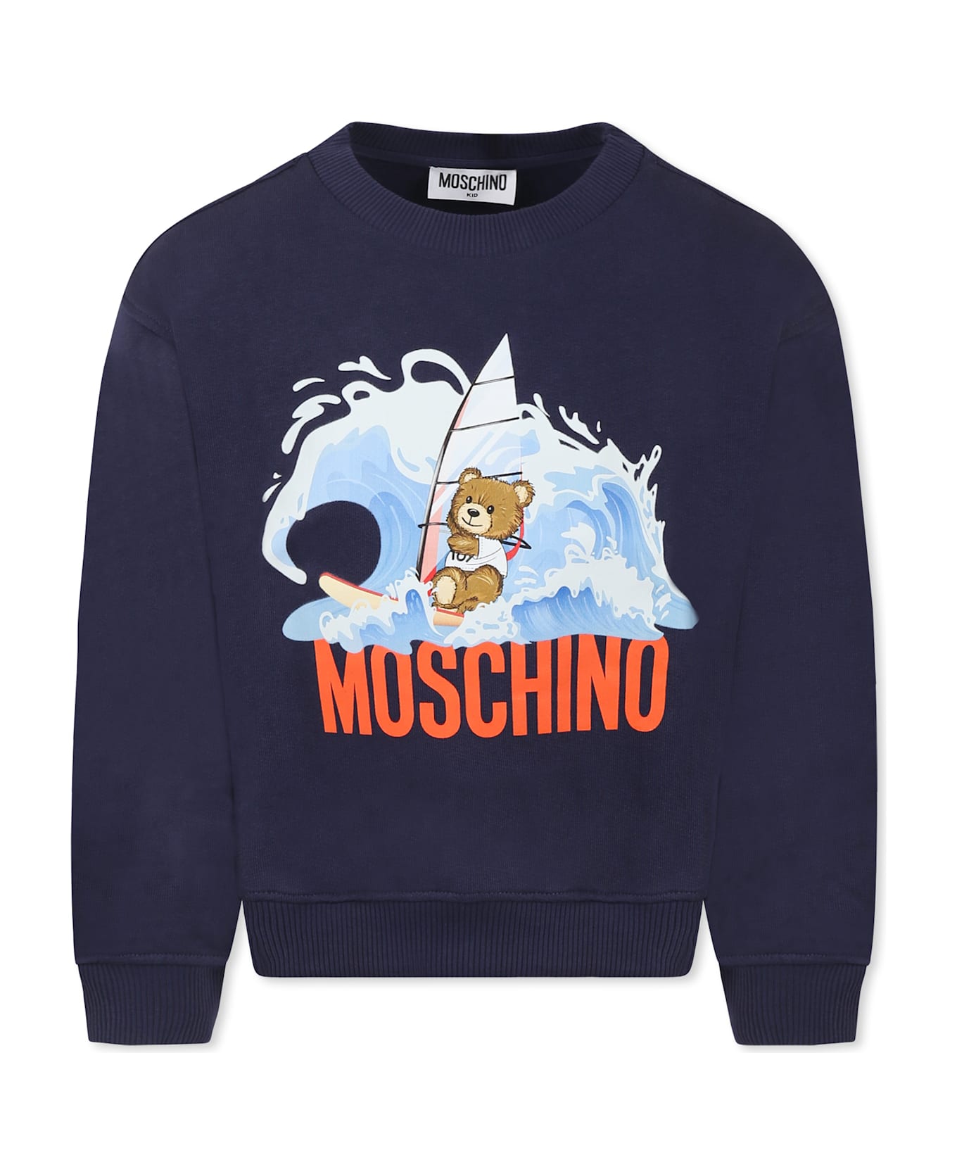 Blue sweatshirt from the Moschino Kids brand, in brushed cotton, with long sleeves, a ribbed crew neck, cuffs and hem. It is embellished with Teddy Bears, windsurf board and logo on the front.