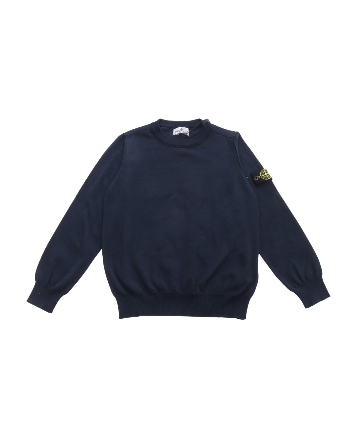 Crewneck cotton pullover, ribbed edges, removable logo detail on the sleeve