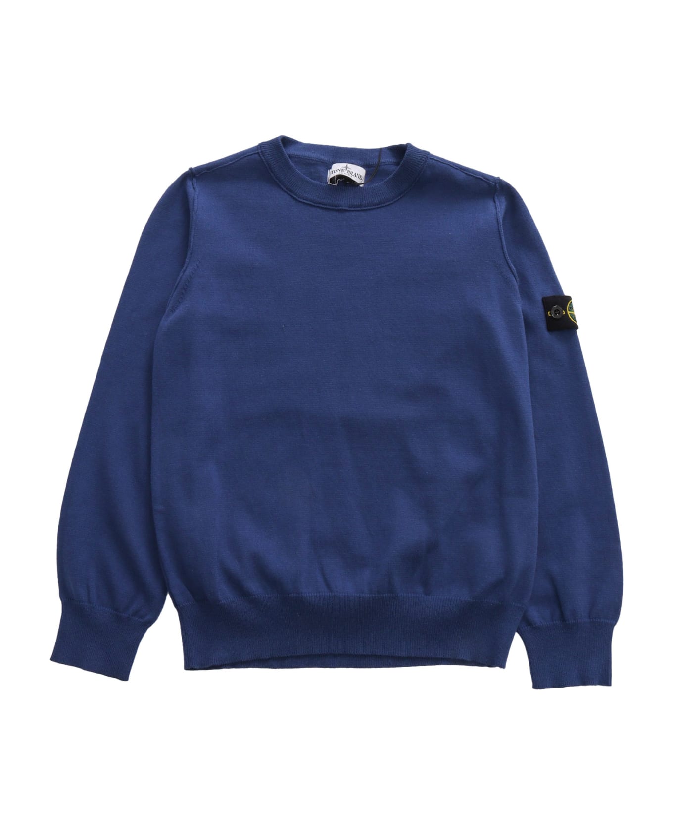 Crewneck cotton pullover, ribbed edges, removable logo detail on the sleeve