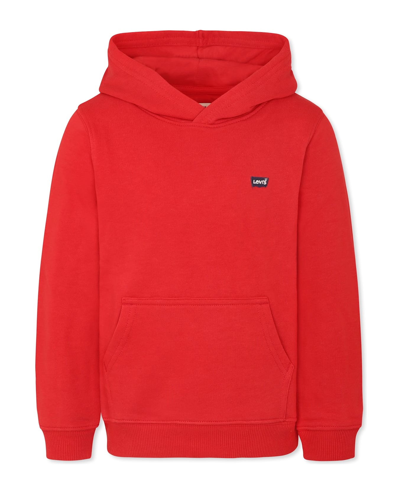 Red sweatshirt in brushed cotton, long sleeves, with hood, front pocket, ribbed cuffs and hem. It is embellished with a logo patch on the chest.