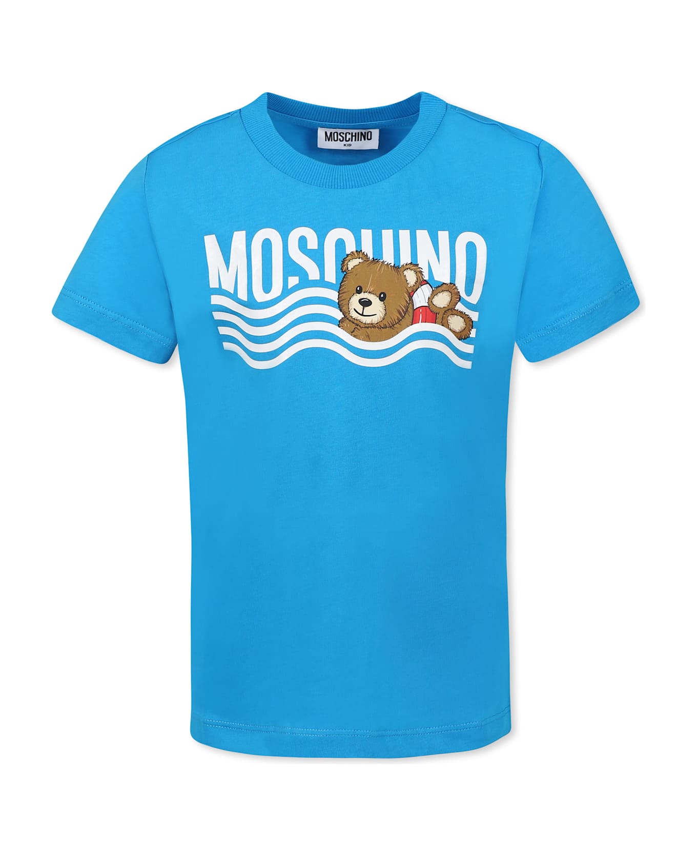 Light blue T-shirt from the Moschino Kids brand, in cotton, with short sleeves and a ribbed crew neck. It is embellished with Teddy Bear, waves and logo on the front.