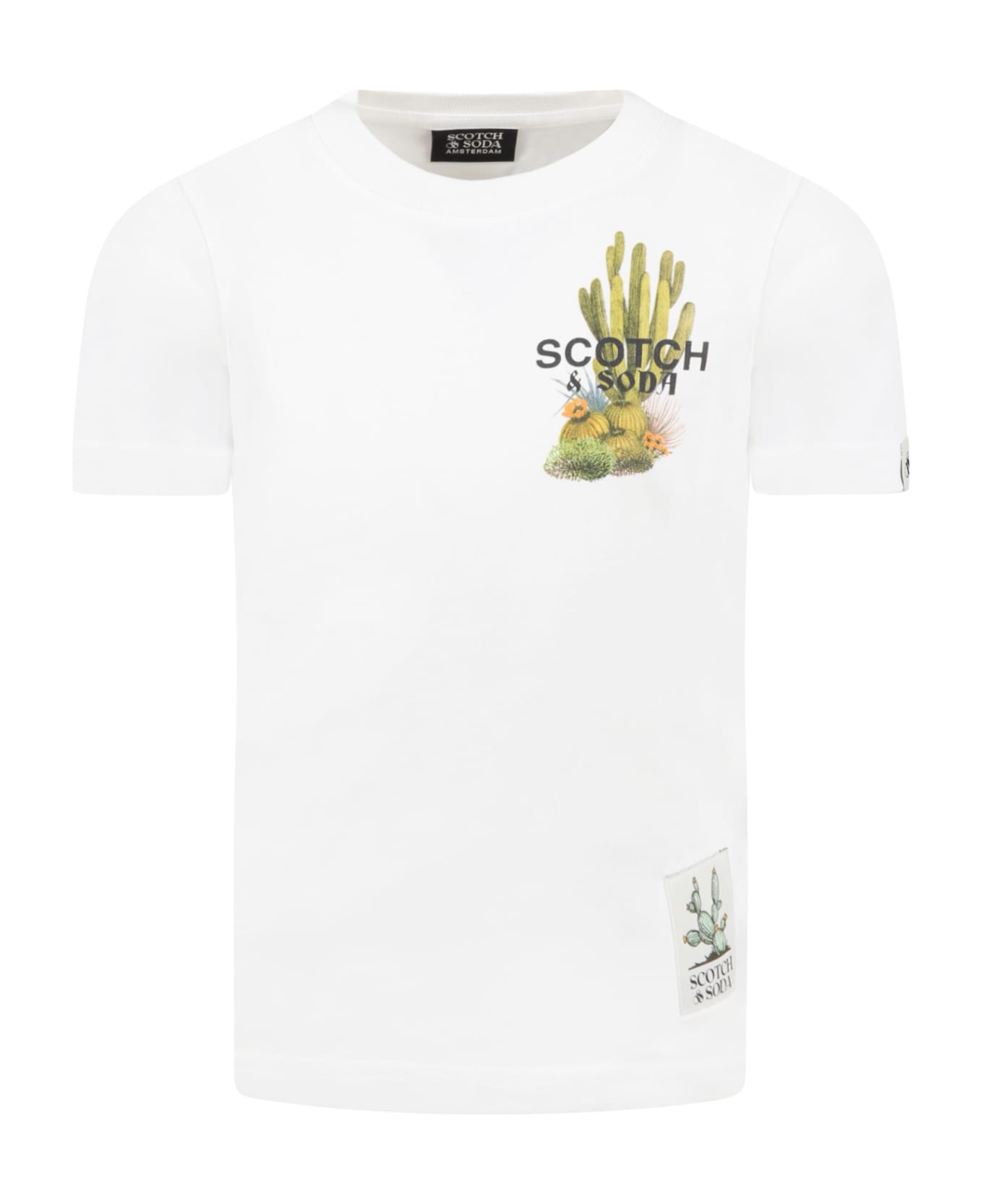 White organic cotton t-shirt, with short sleeves and ribbed crew neck. It s embellished with colorful cactus, black logo and patch, on the front and colorful print with black writings, on the back.