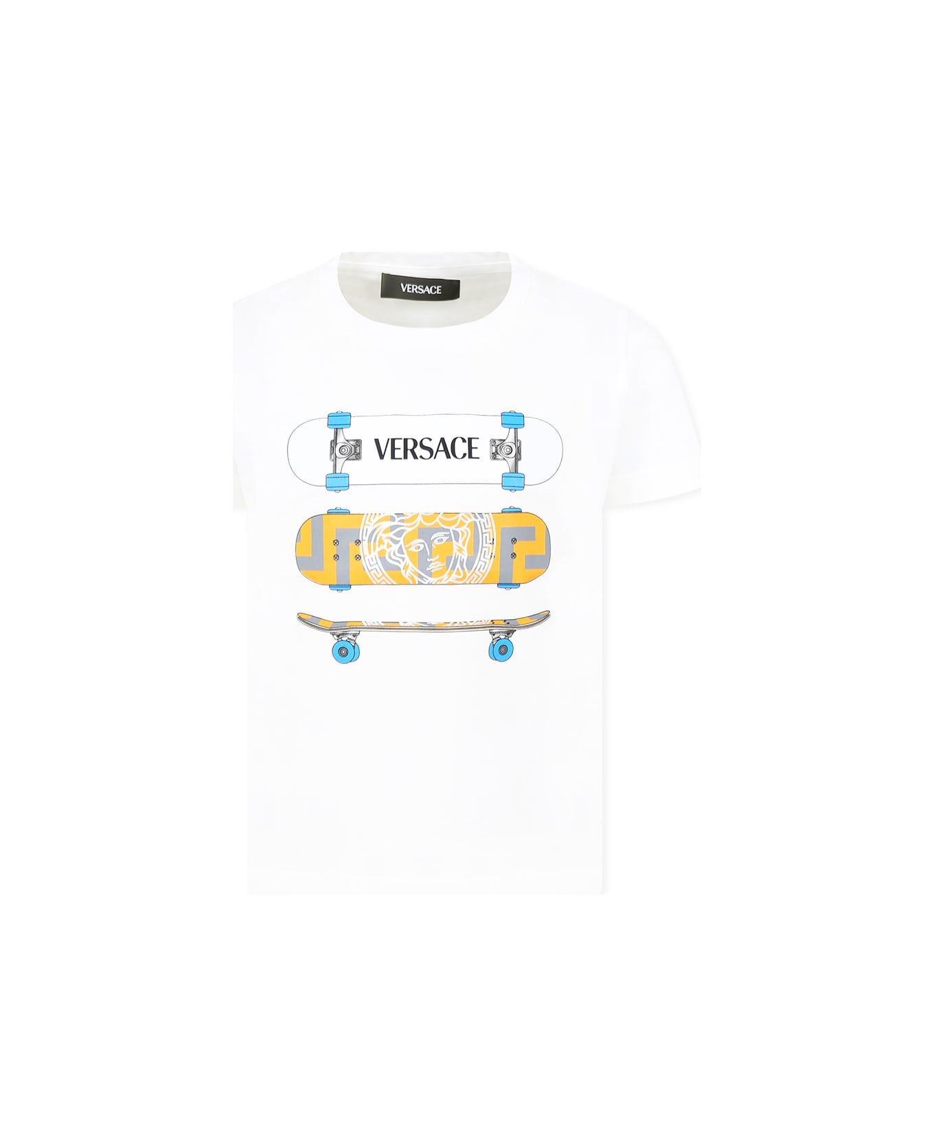 White t-shirt from the luxury brand Versace, made from cotton jersey, with short sleeves, ribbed crew neck and snap button fastening on the shoulder. It is embellished with iconic Medusa, Versace logo and skateboard printed on the front.