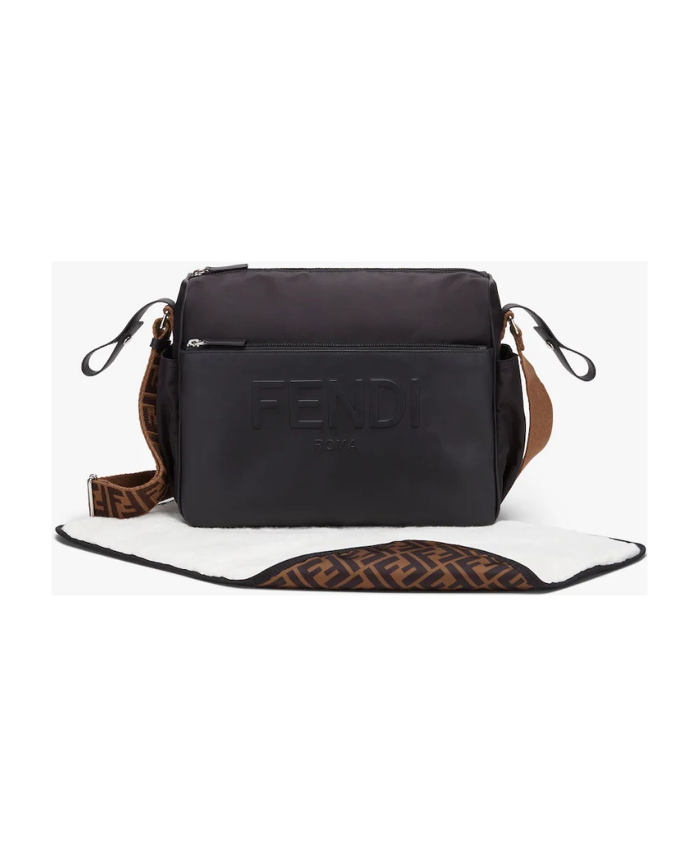 With leather front pocket and embossed Fendi logo. Fabric shoulder strap