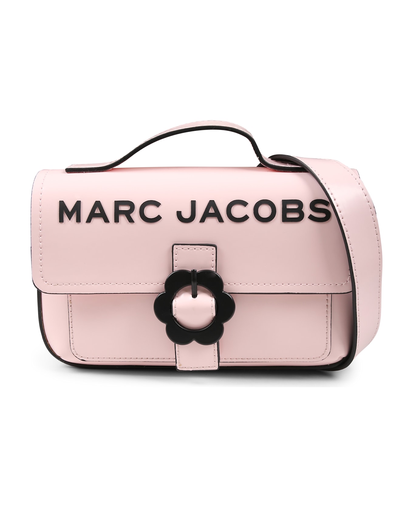 Pink bag with handle, adjustable shoulder strap, front flap with magnetic button and pocket on the front. It is embellished with embossed logo on the front.