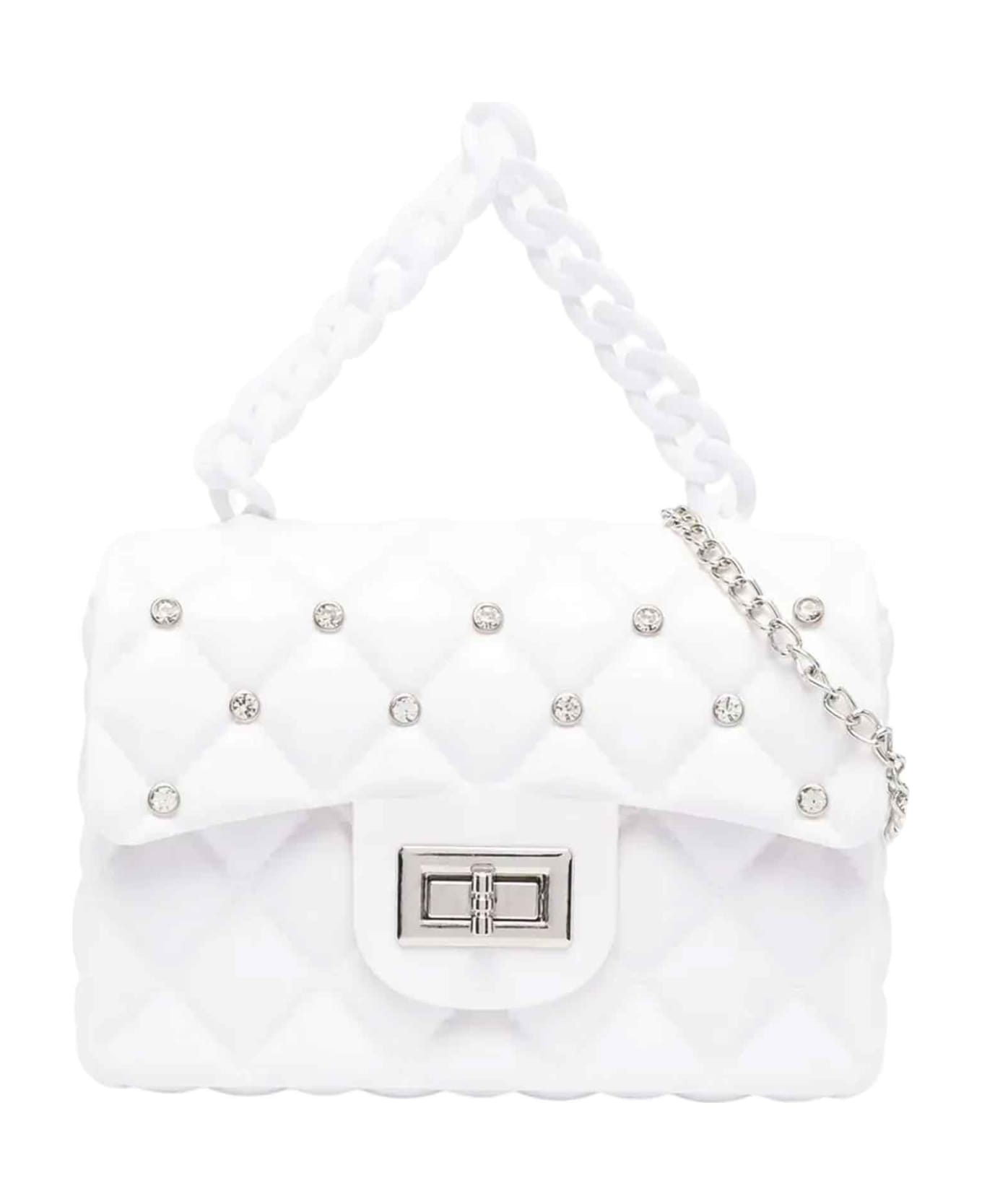 white bag girl. diamond quilted design, rhinestone embellishment, chain shoulder strap, chain top handle, flap top, twist lock closure and main compartment. PVC 100%