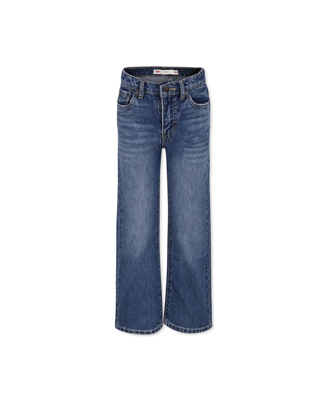 Blue denim jeans, five pockets, with belt loops, front zip and button closure and adjustable waist thanks to internal elastic with buttons. They are embellished with a logo patch on the back.